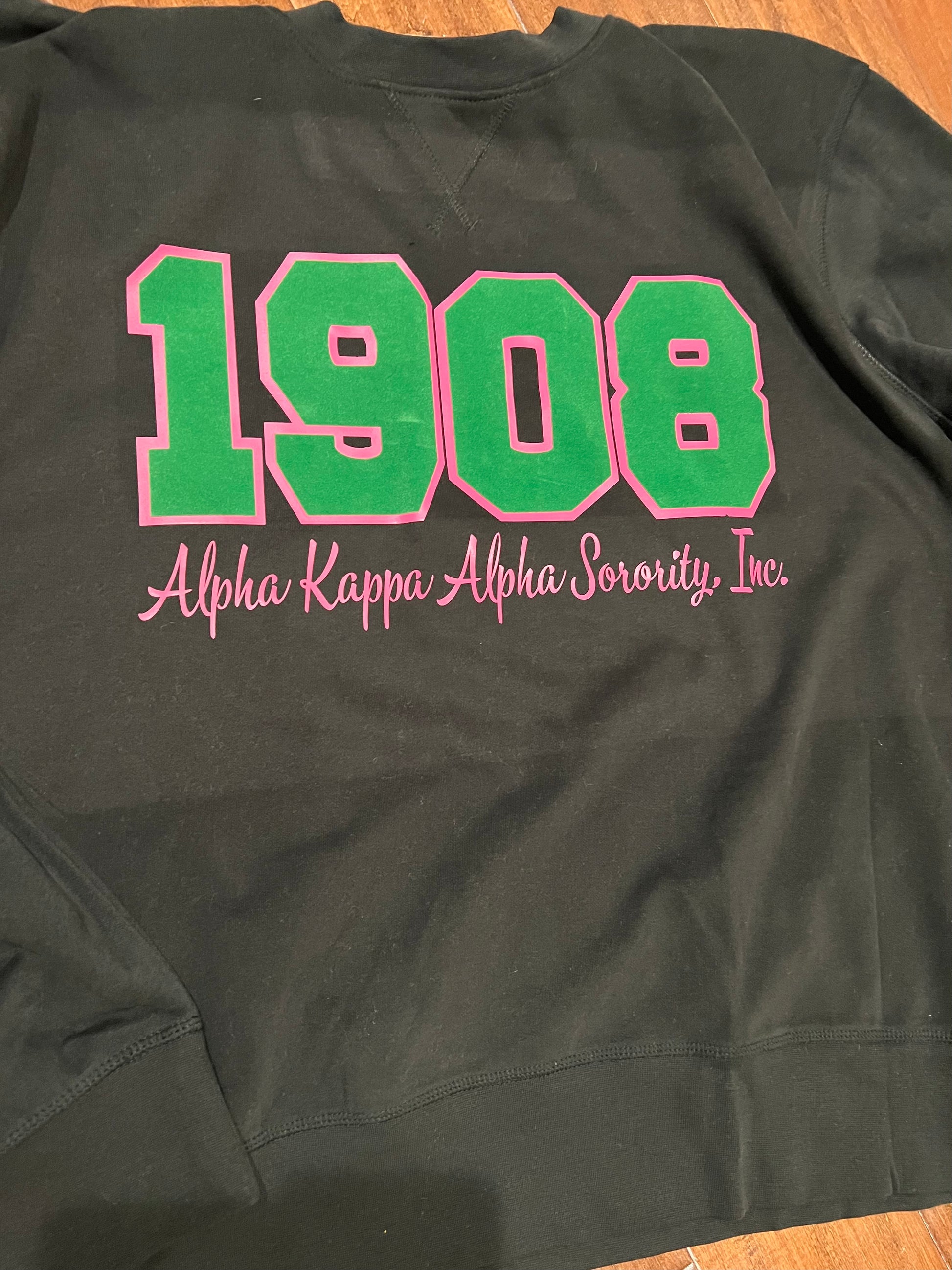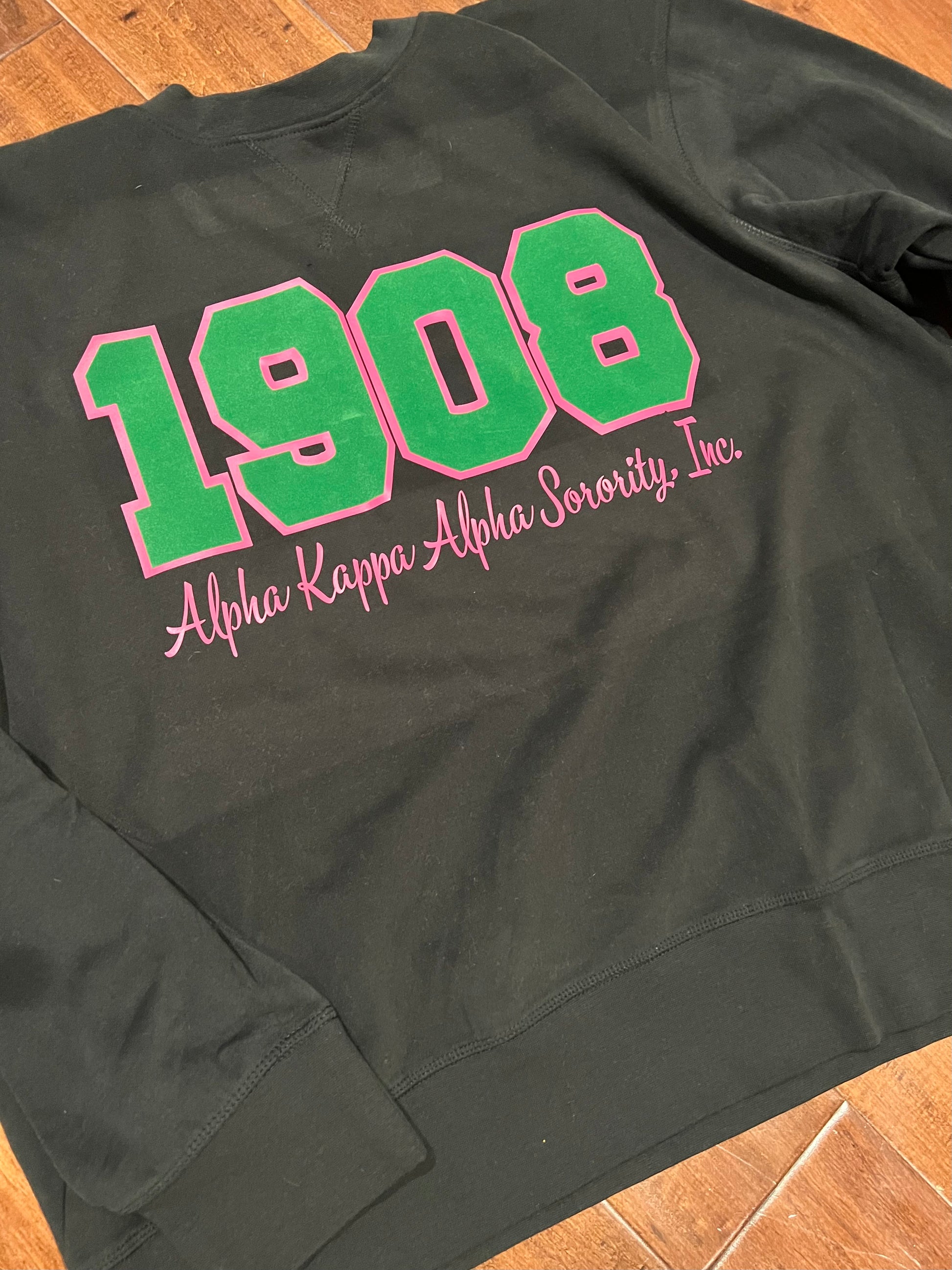 The focal point of this sweatshirt is the striking "1908" lettering, meticulously crafted in 6-6.6 inches of flocked material. This unique technique creates a textured, felt-like layered image that adds depth and dimension to the design. Below the distinguished "1908", the Sorority Name is elegantly displayed, symbolizing unity and tradition.
