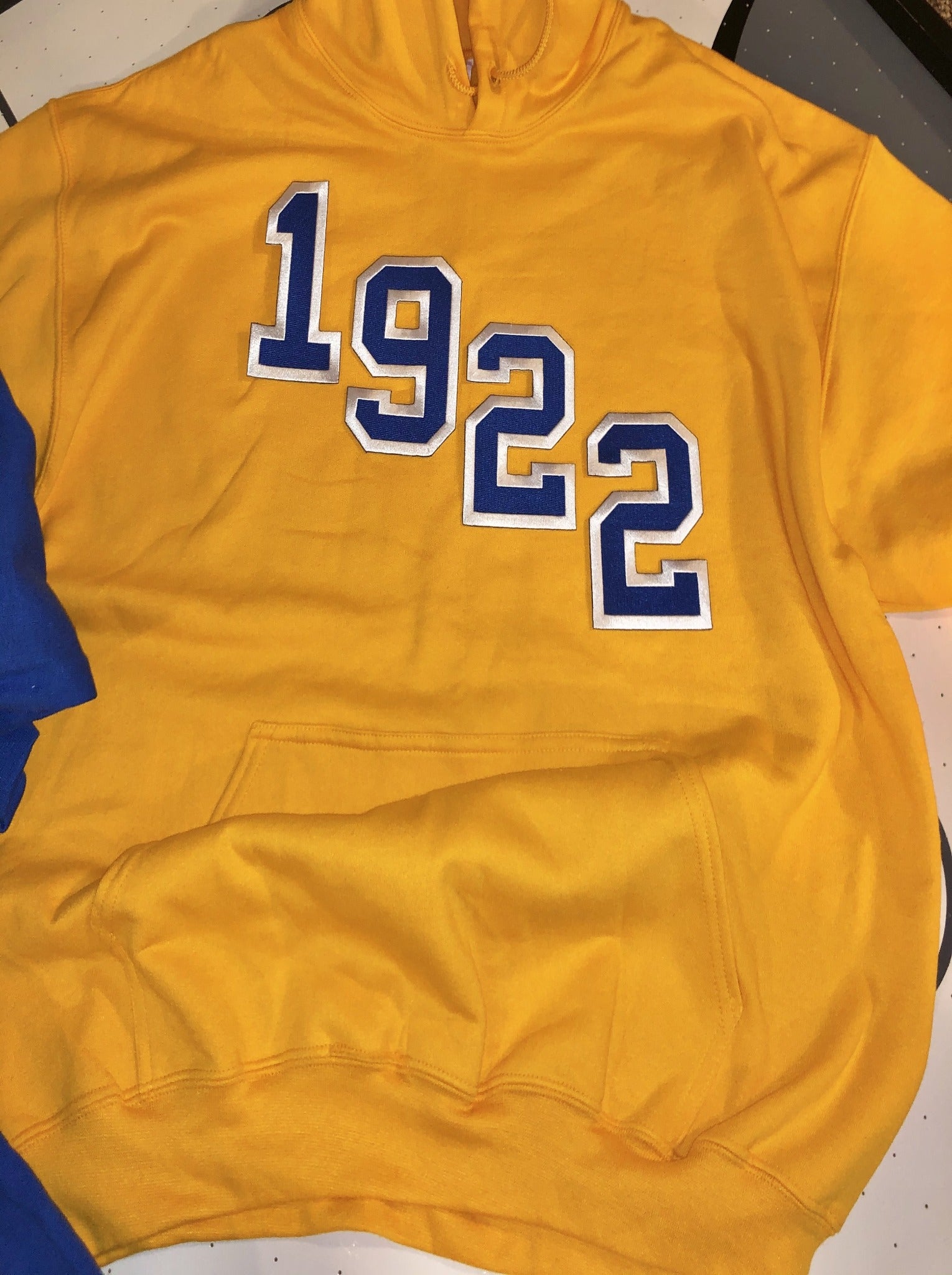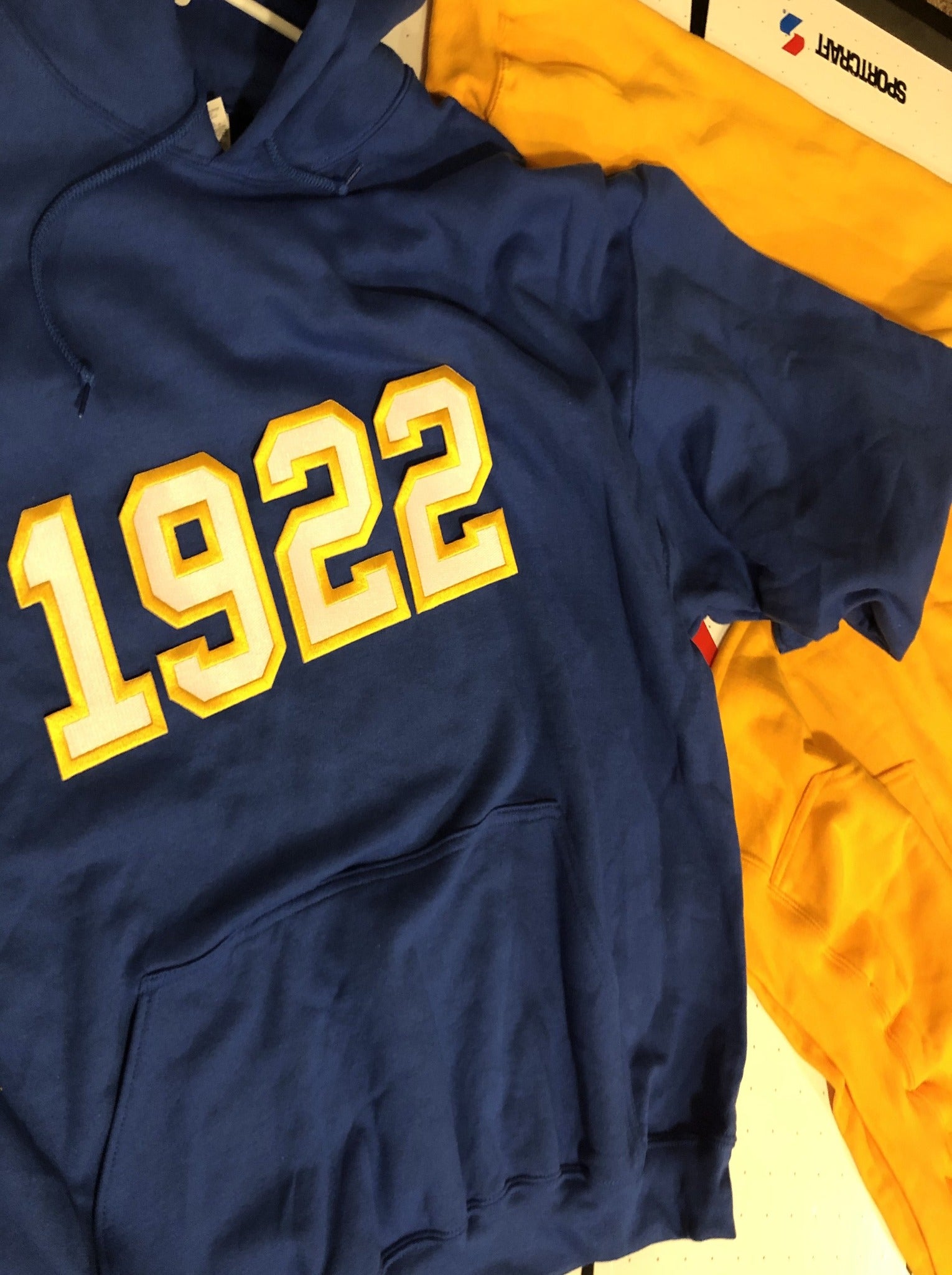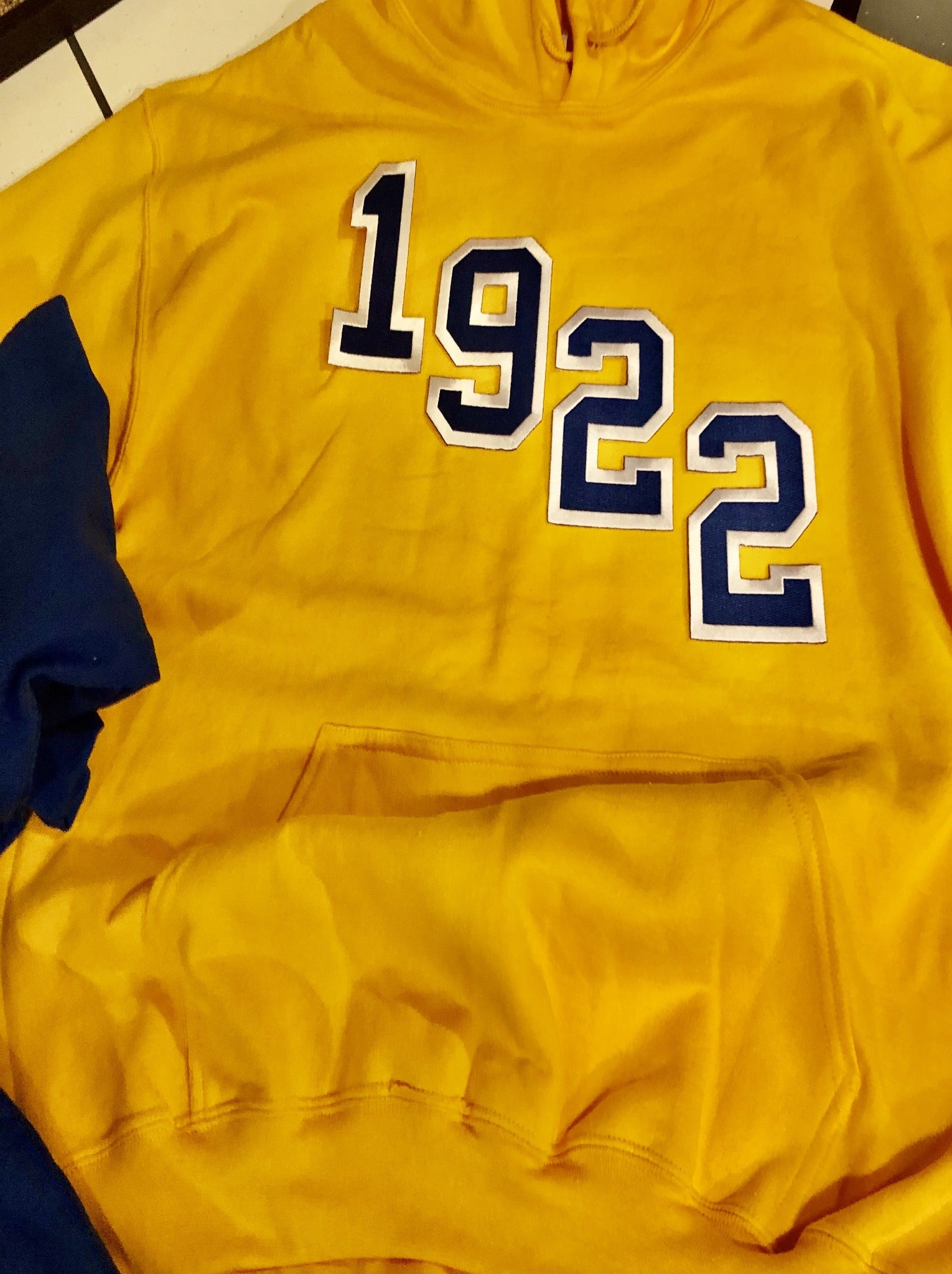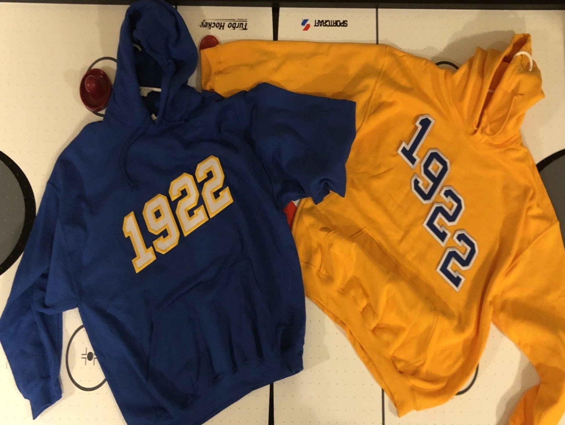 1922 Hooded Sweatshirt is available in 3 colors: Royal Blue, Gold, or Grey.