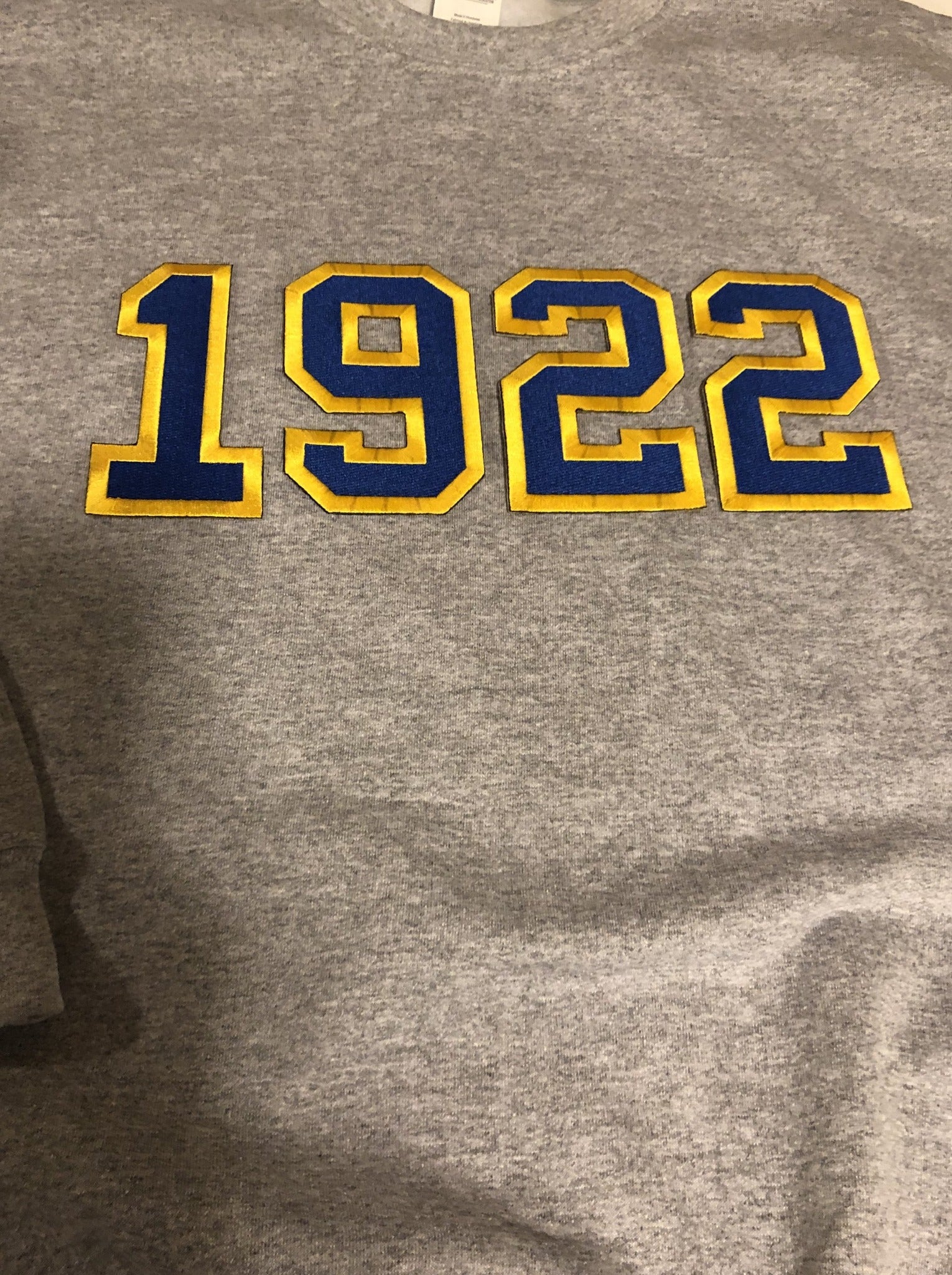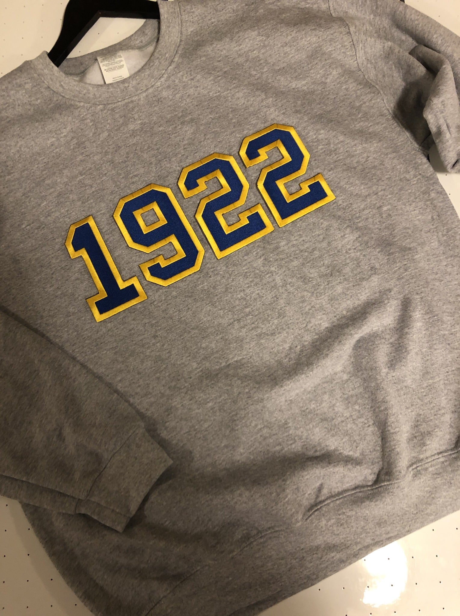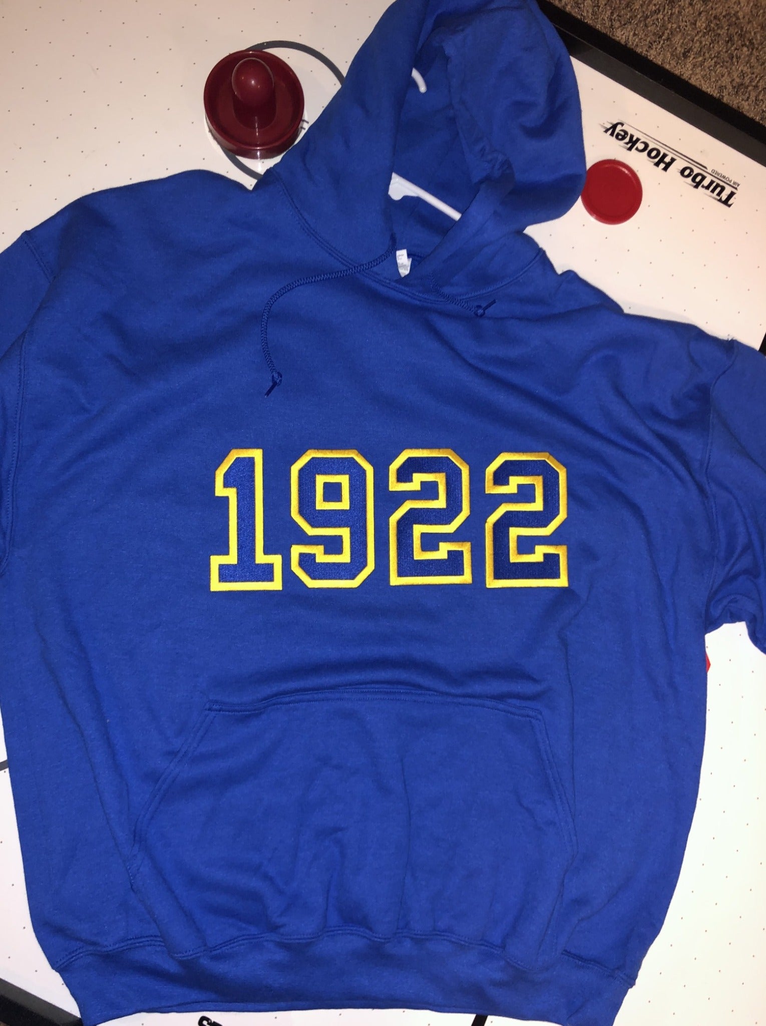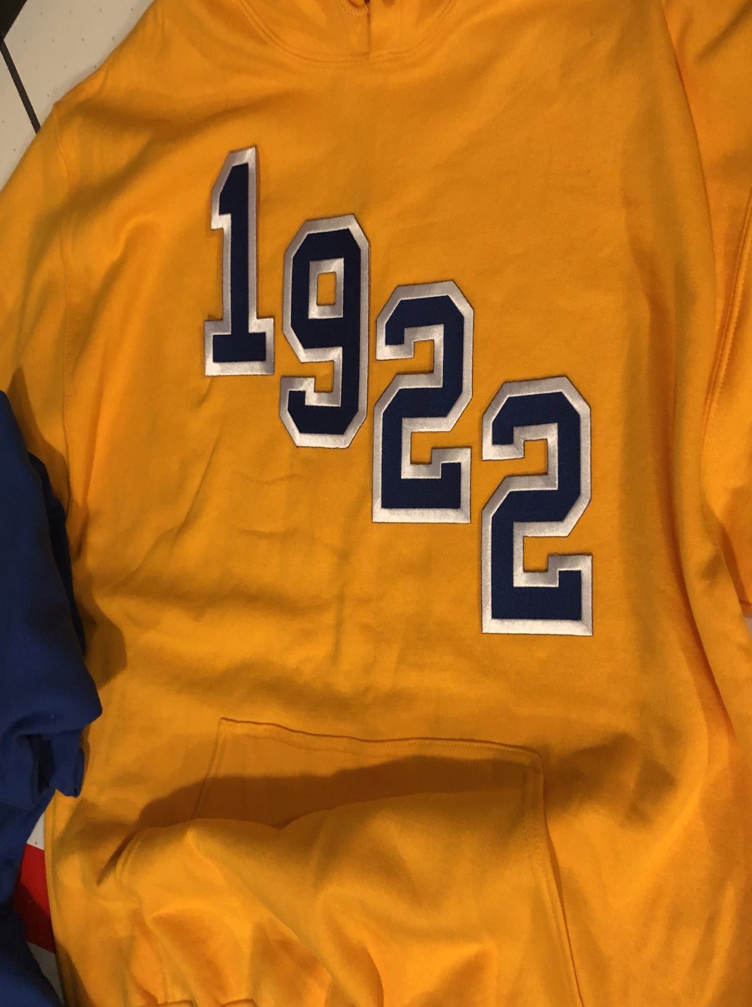 1922 Hooded Sweatshirt is available in 3 colors: Royal Blue, Gold, or Grey.