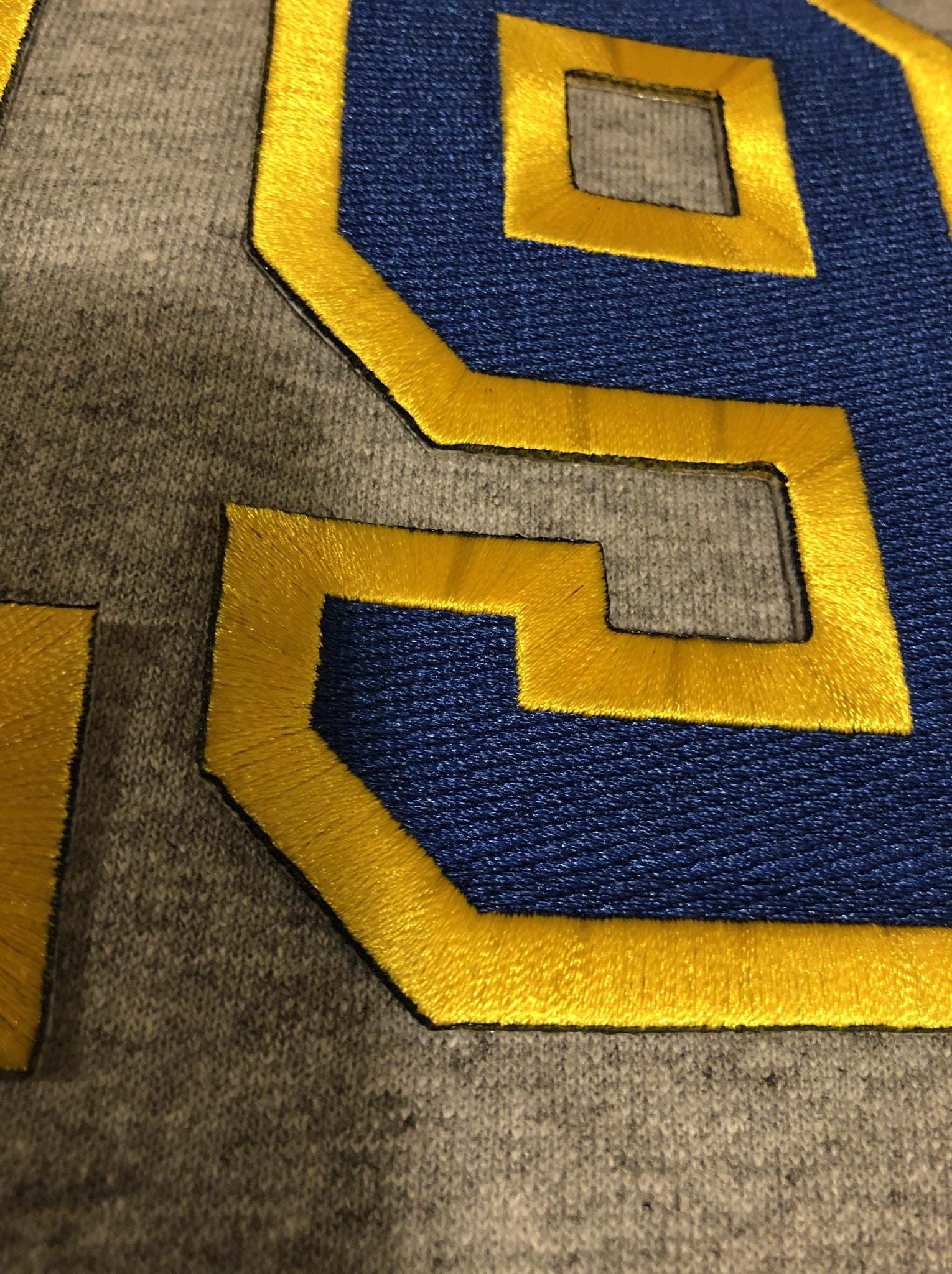 Embroidered numbers are available in two options: Gold/Blue, Gold/White, or White/Blue