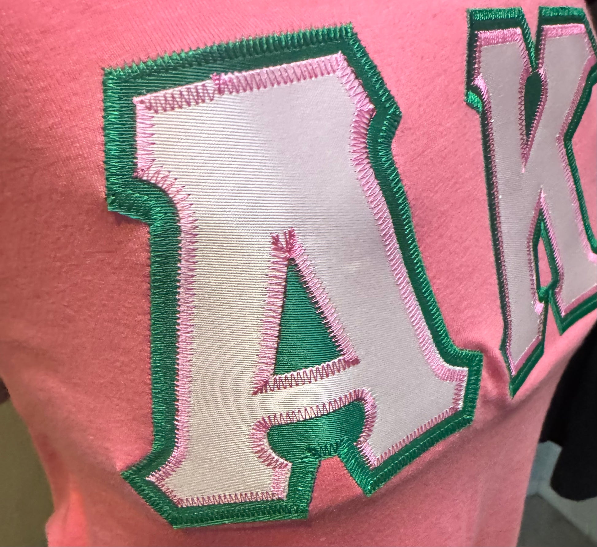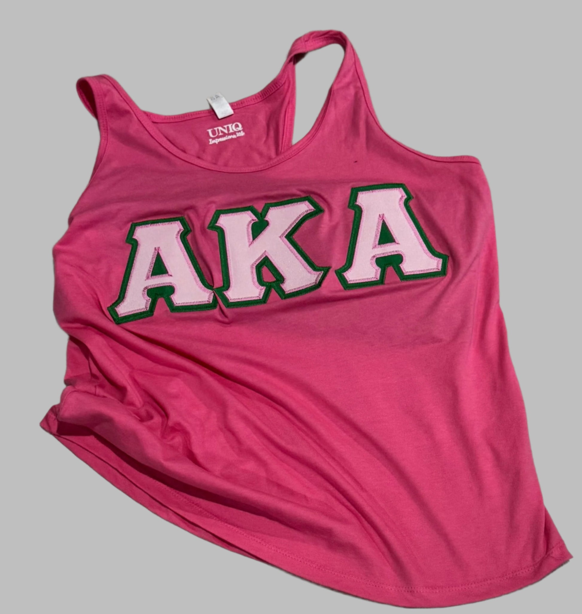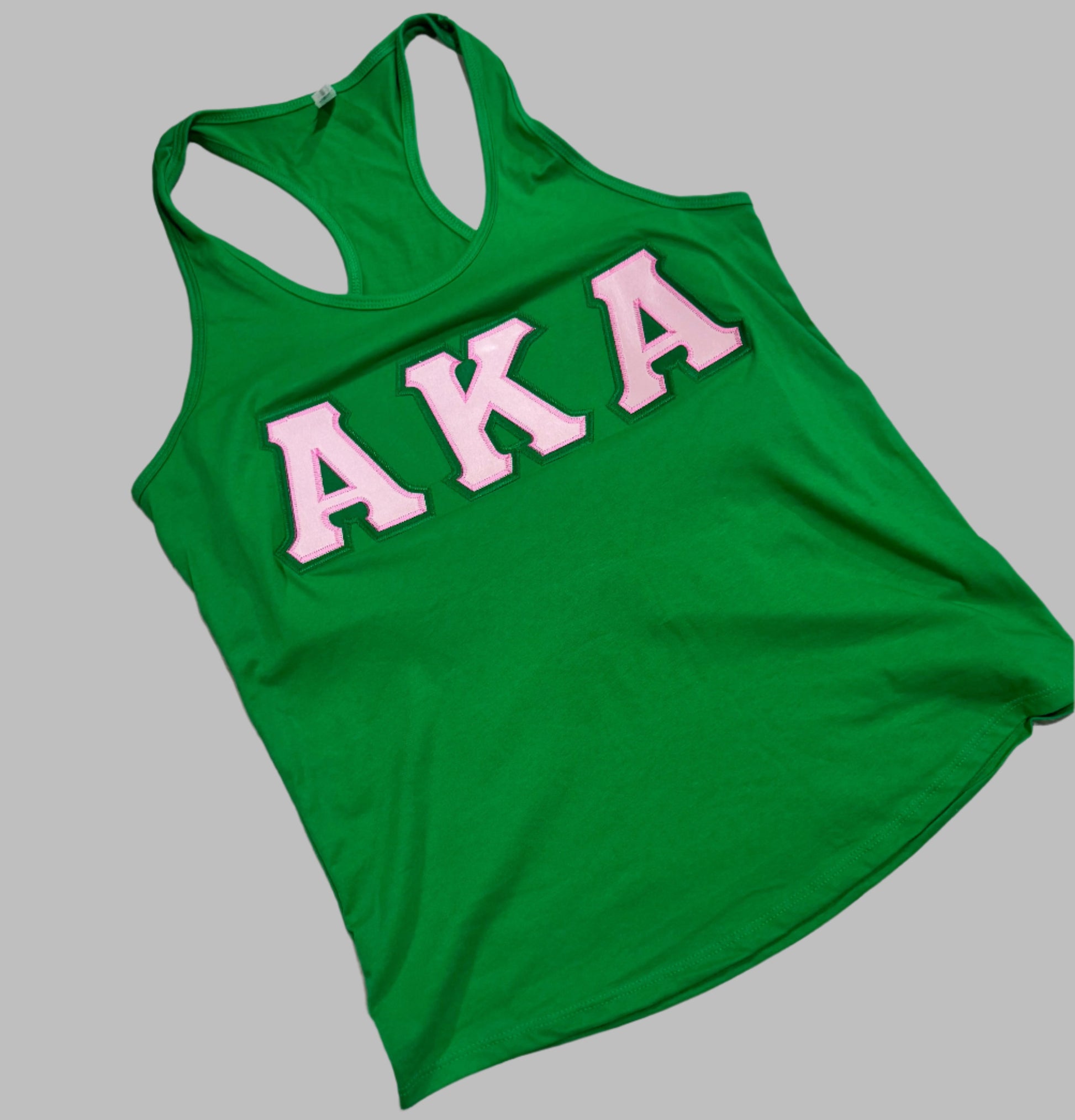 Razorback tank top with direct-to-garment embroidery. Twill green base with pink top letters.