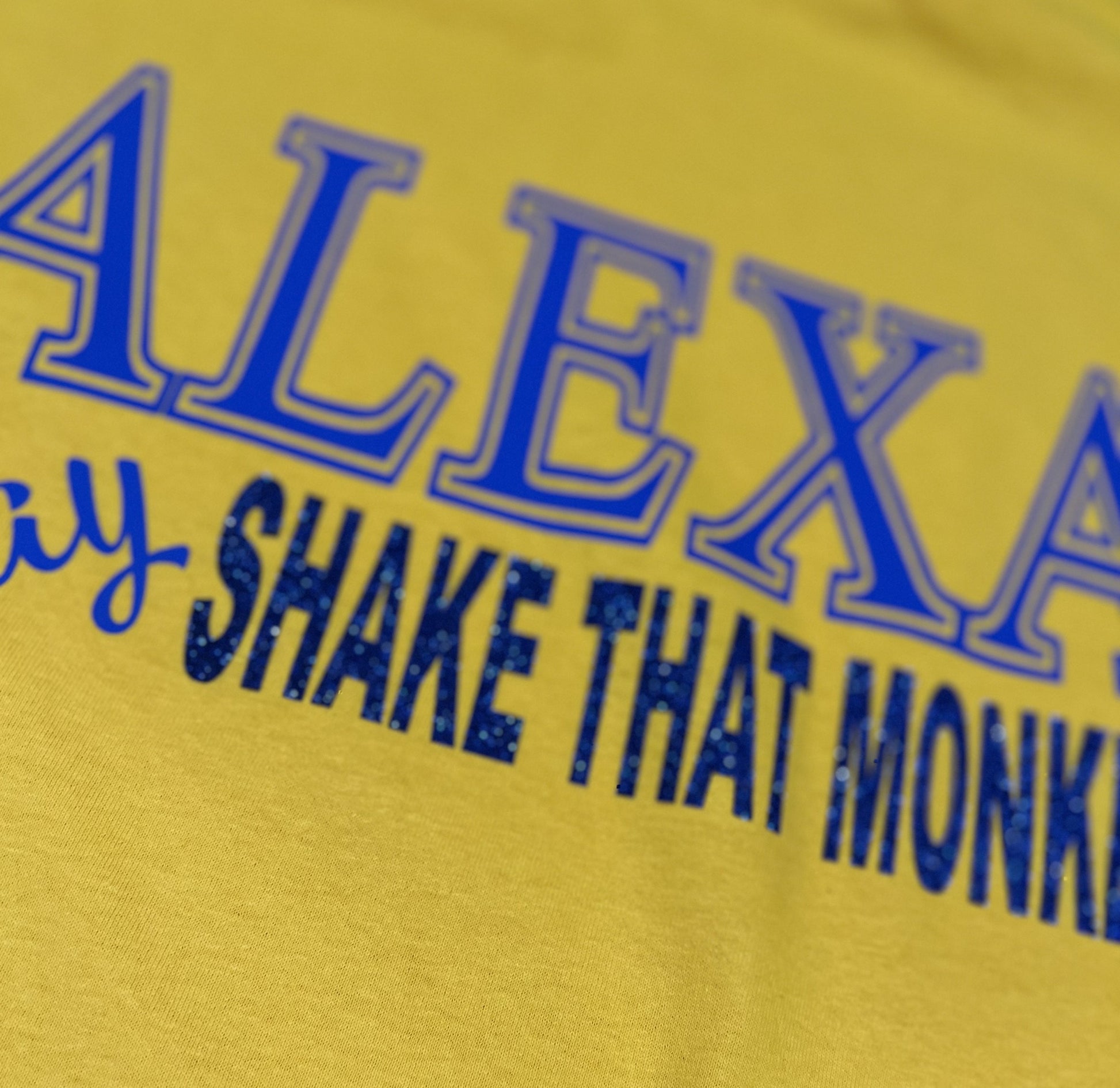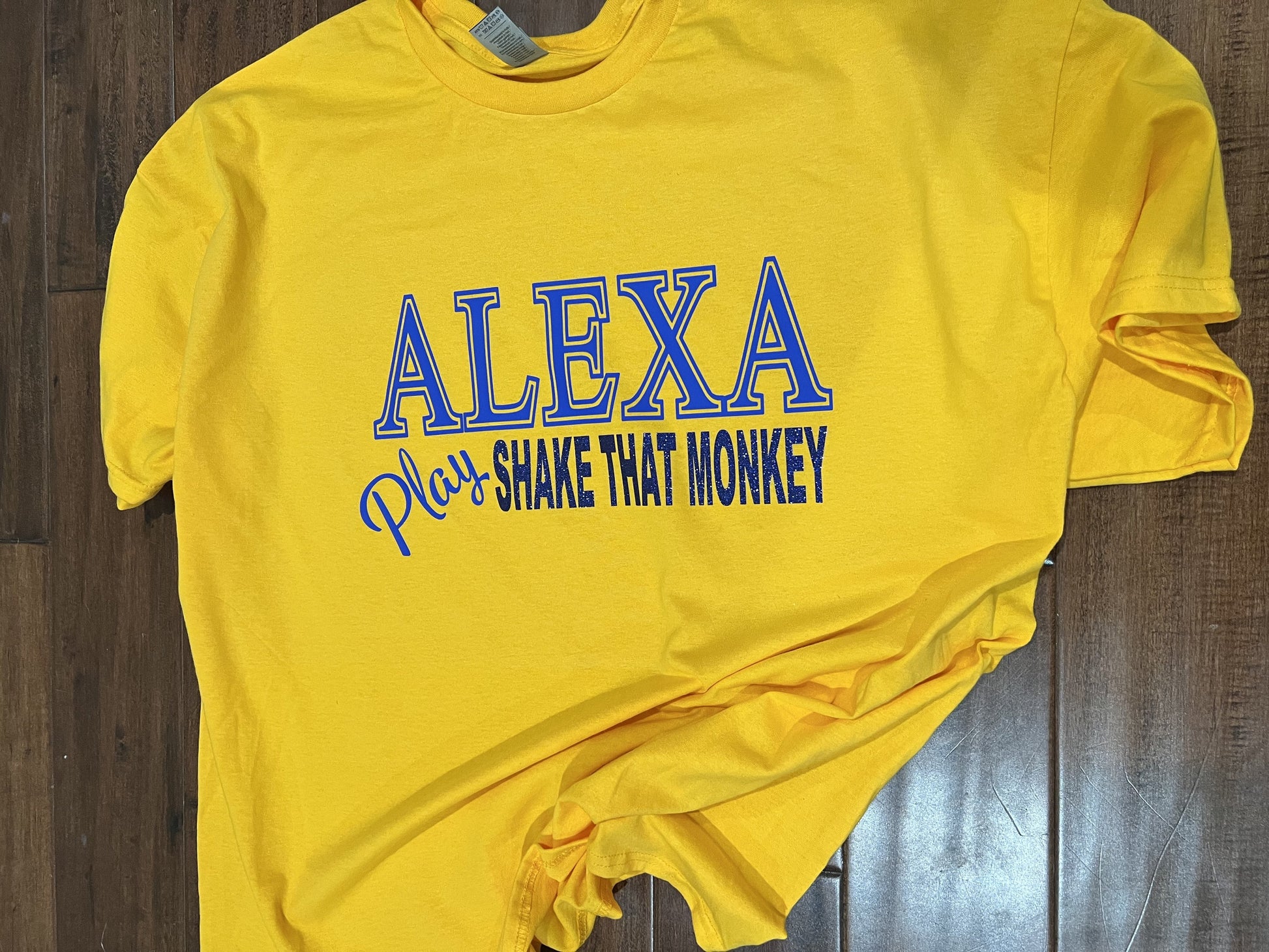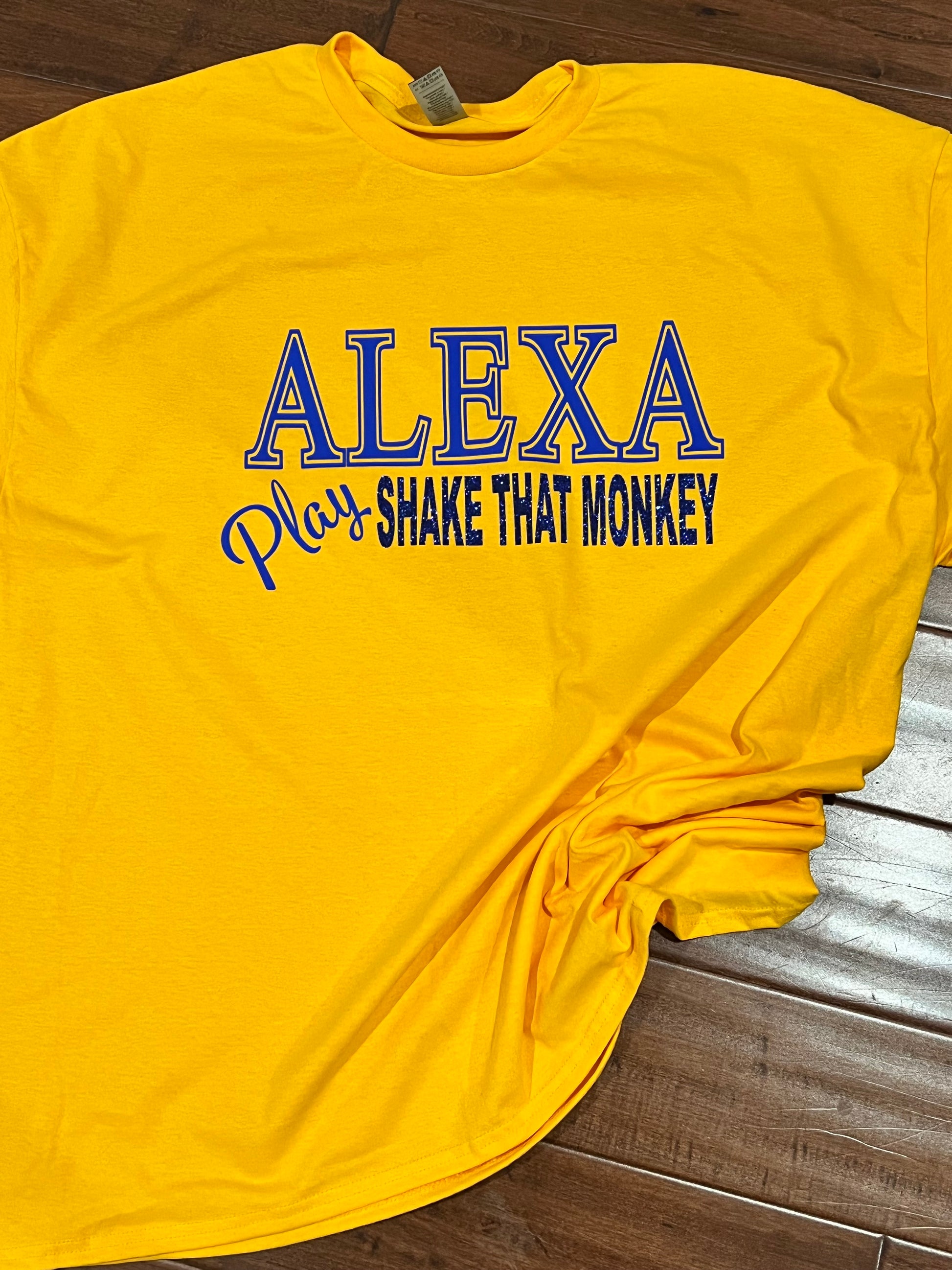 A play on the use of "Alexa", play "Shake That Monkey". Short sleeve with glitter accent. Available in blue with gold lettering.