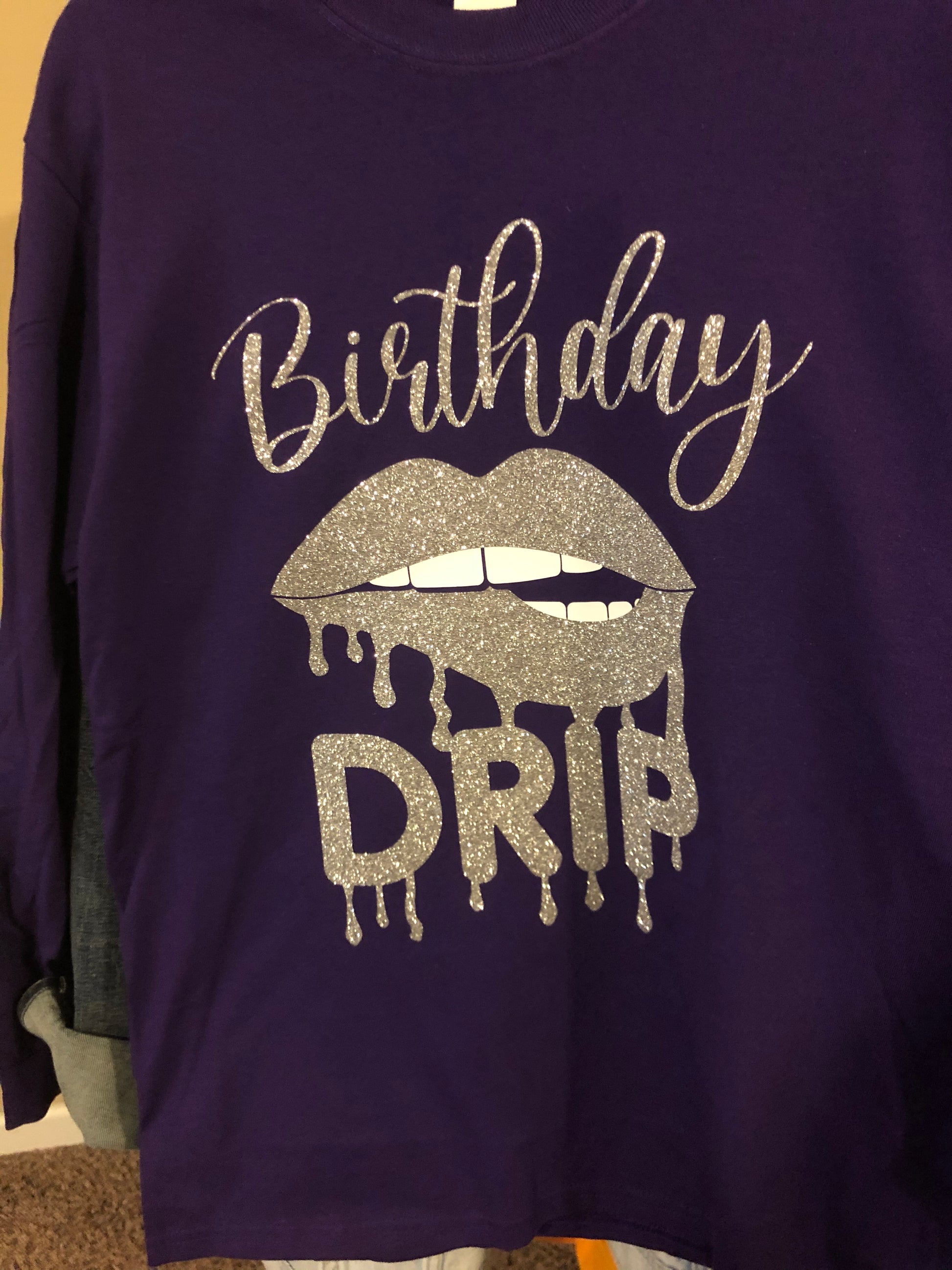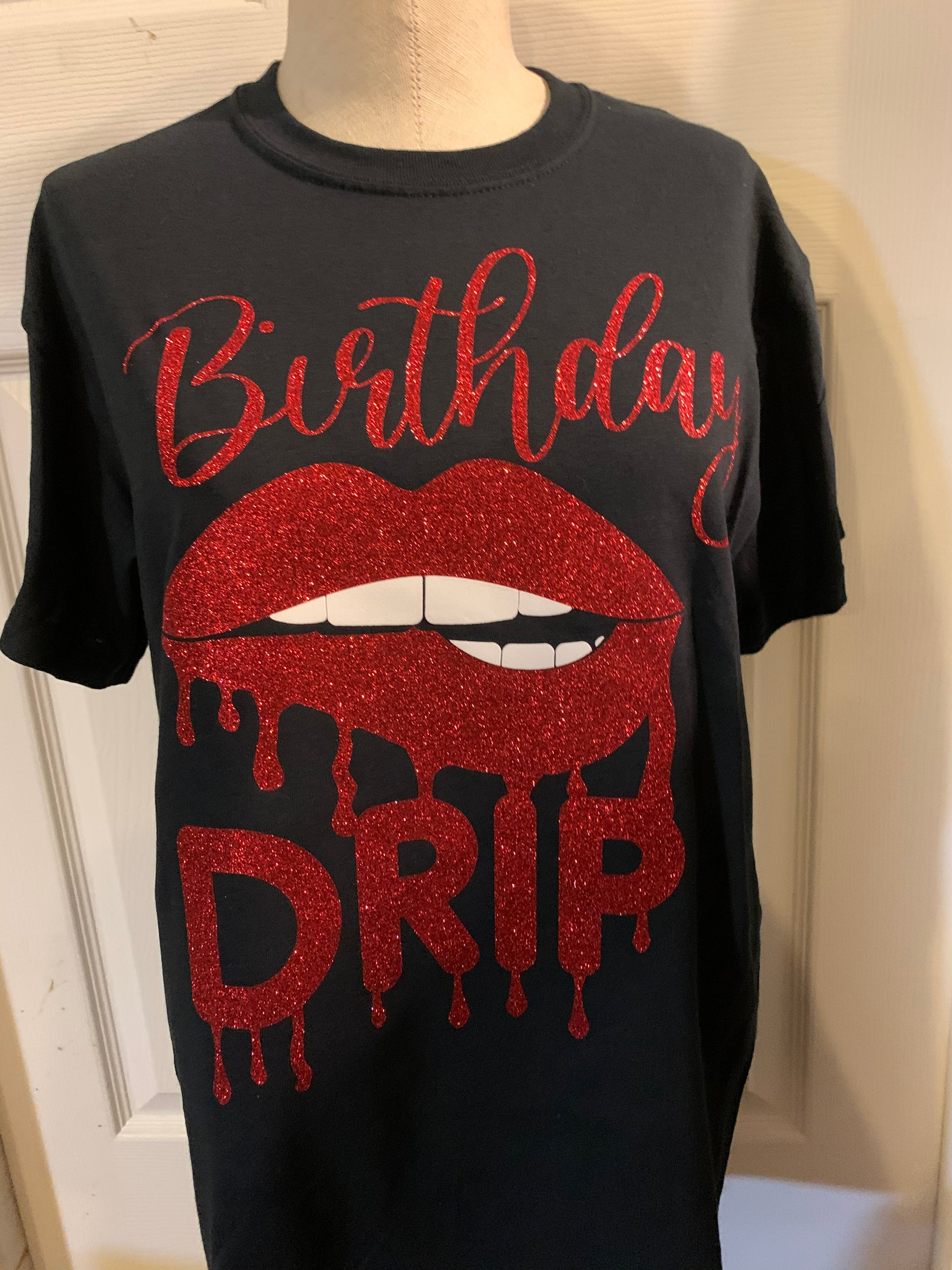 Birthday Drip is scripted in glitter font, while the short sleeved t-shirt can come in any desired color.