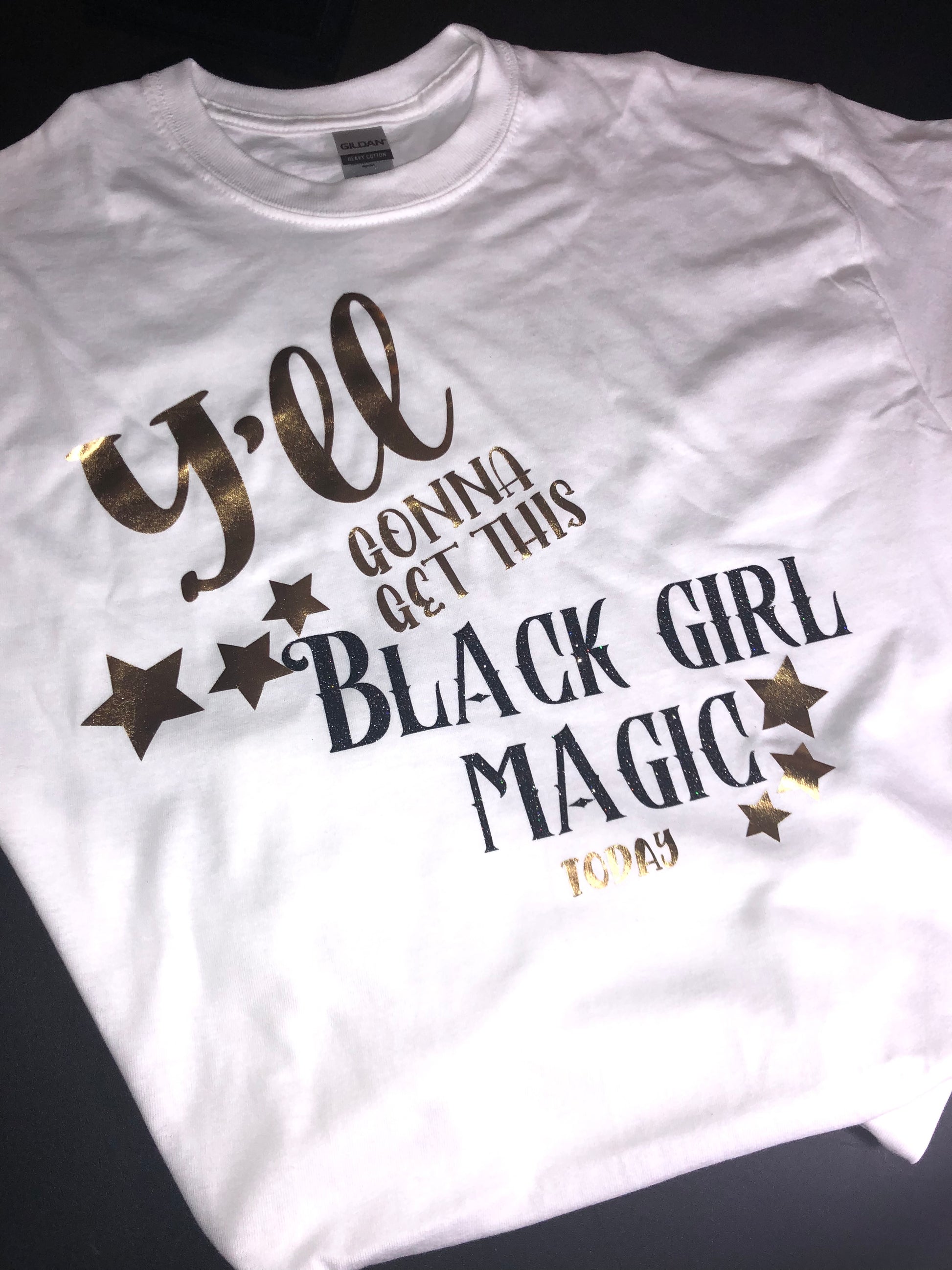 This shirt reads “Ya’ll one get this Black Girl Magic”. The white tee has script in gold metallic and black glitter. Also available in a white shirt with gold metallic an white glitter print.