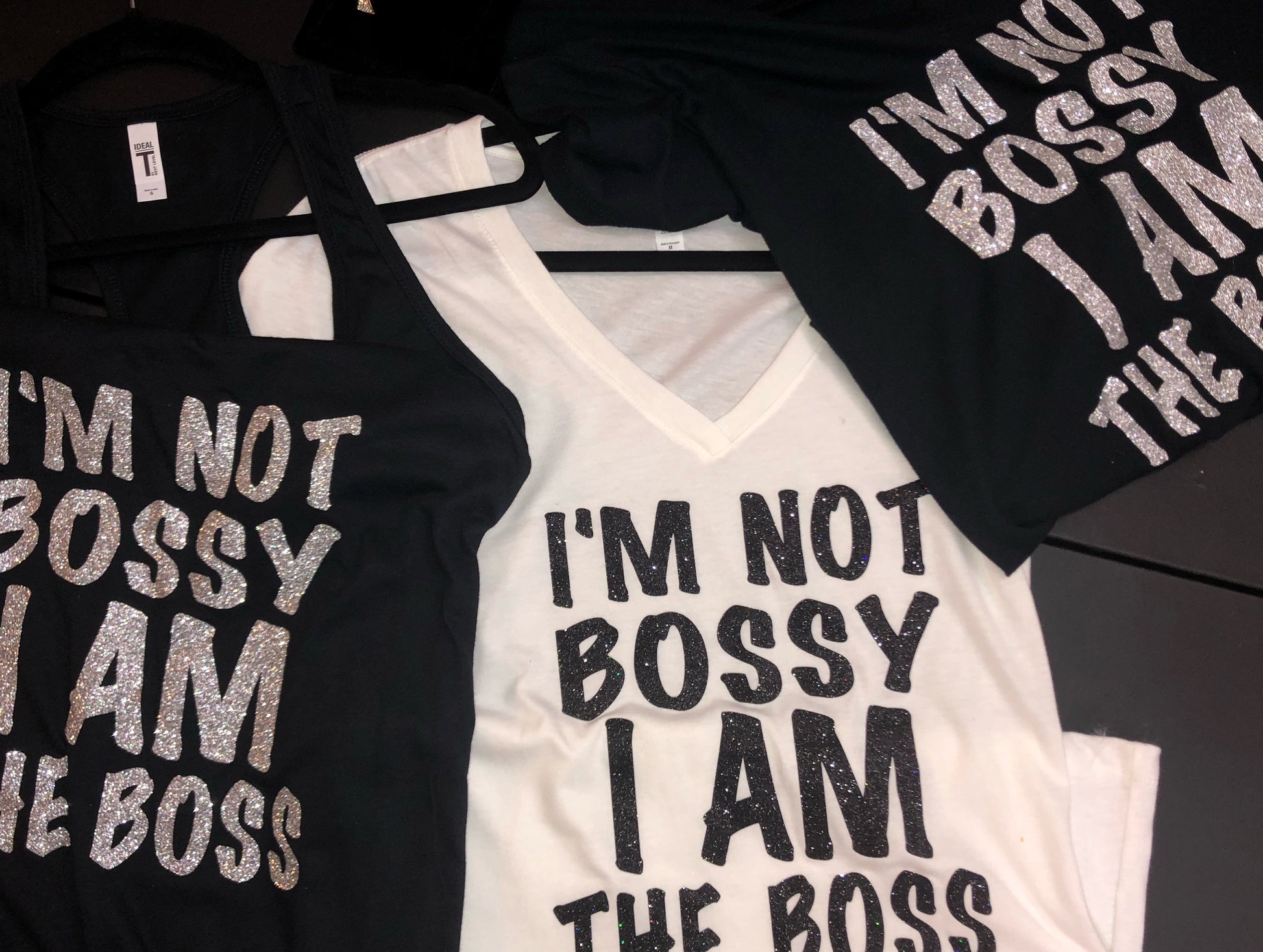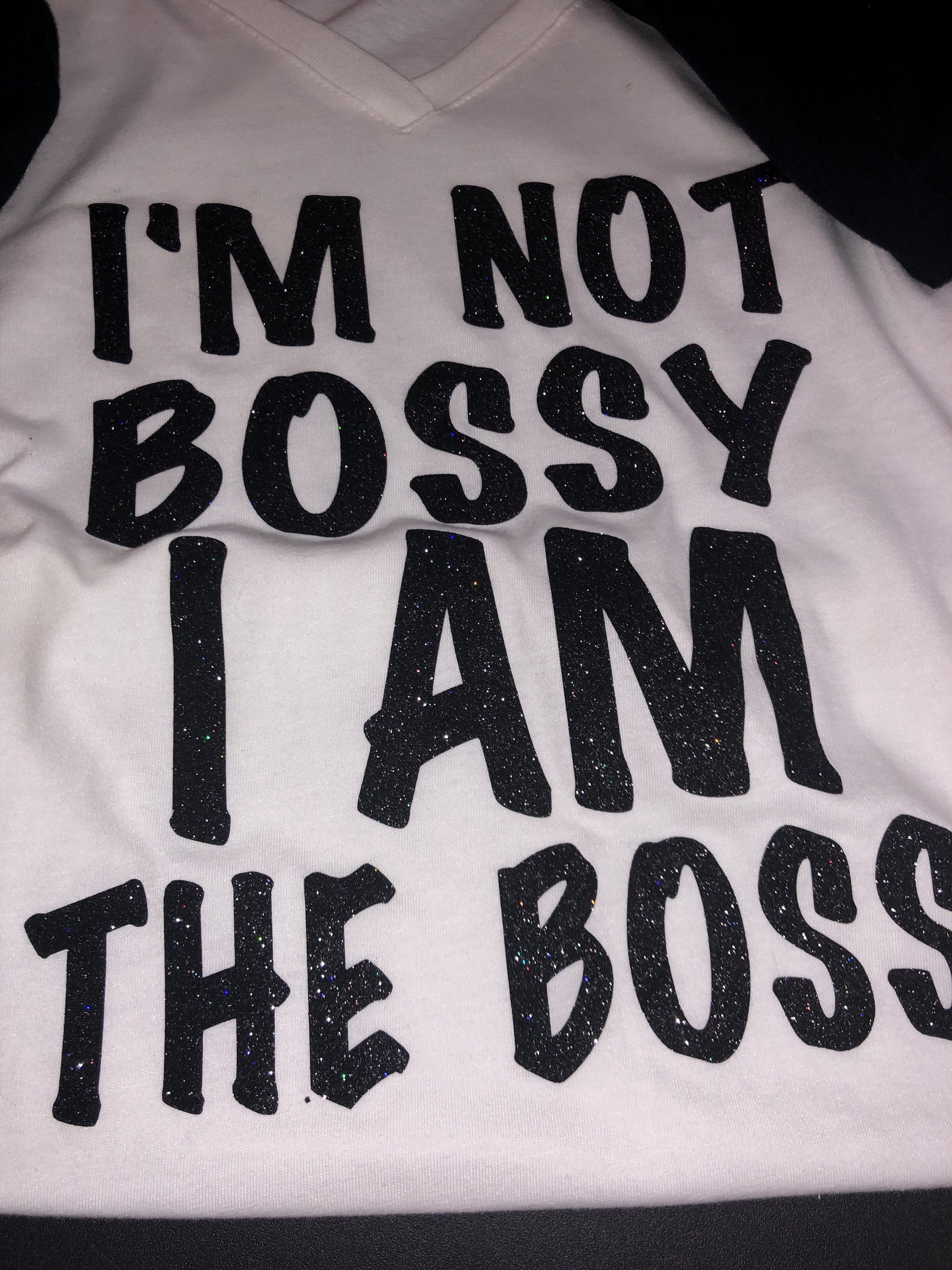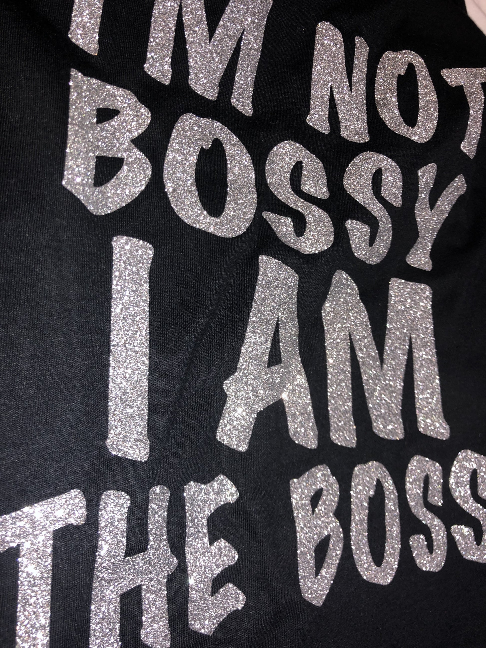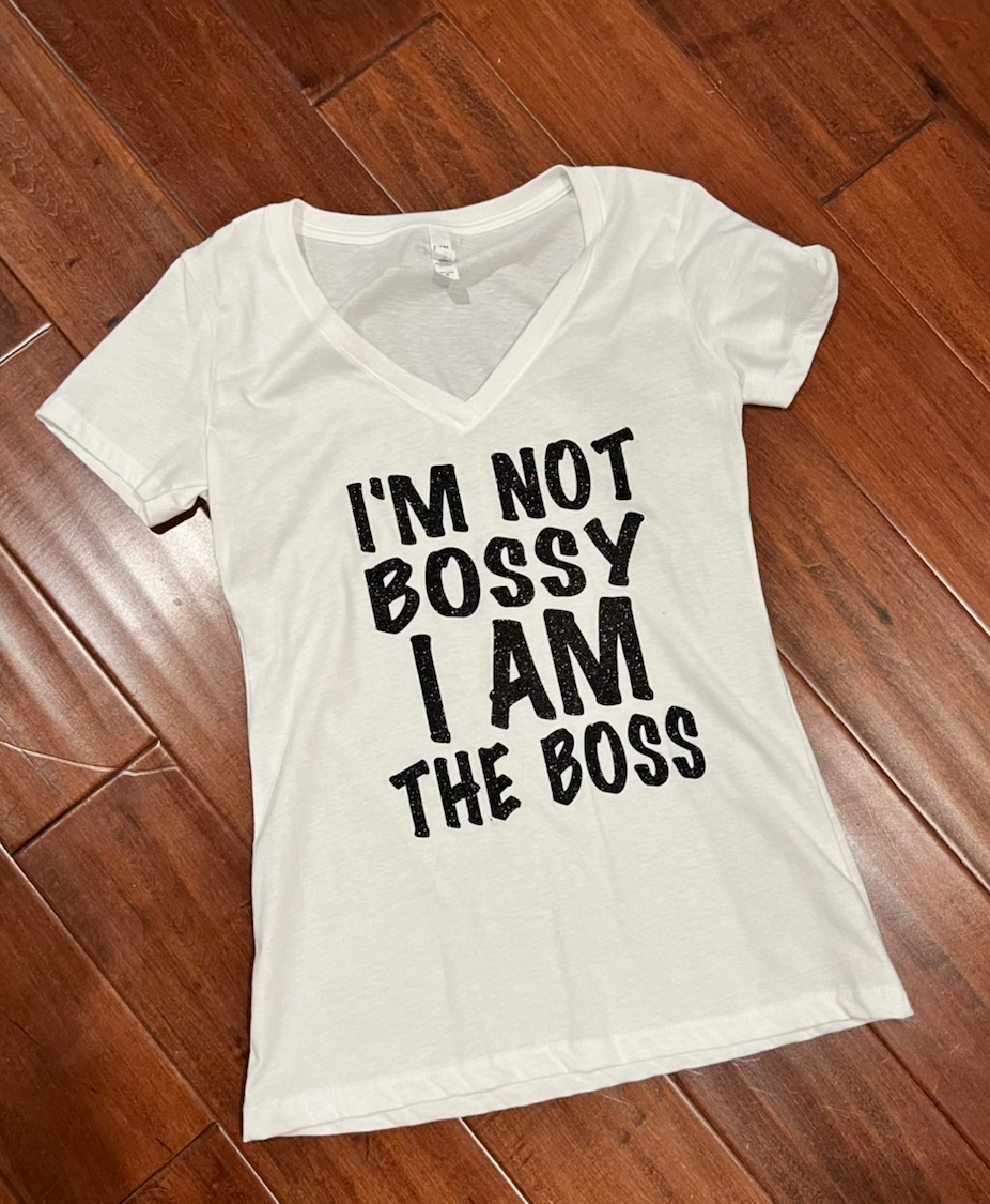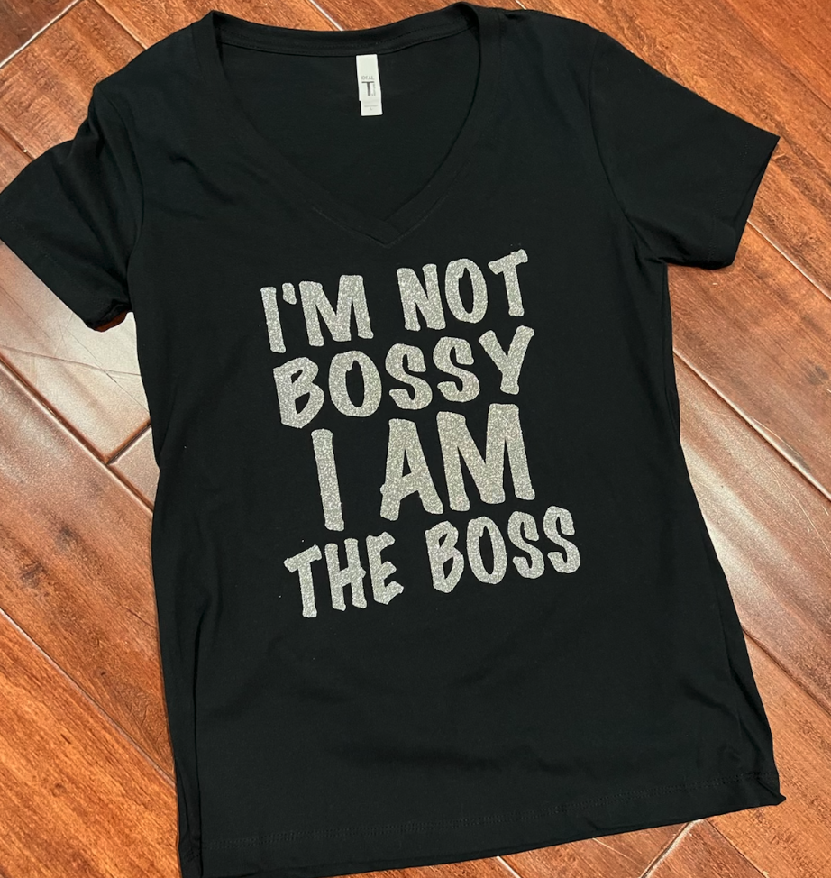 "I AM NOT BOSSY I AM THE BOSS" reads as the moniker of Uniq Impressions. Can come in a multitude of colors but listed here in black or white v-neck. Contact seller if you wish to custom colorize.