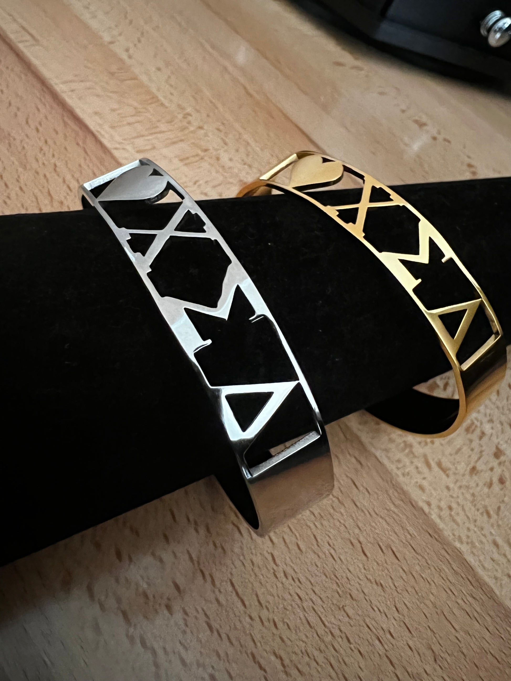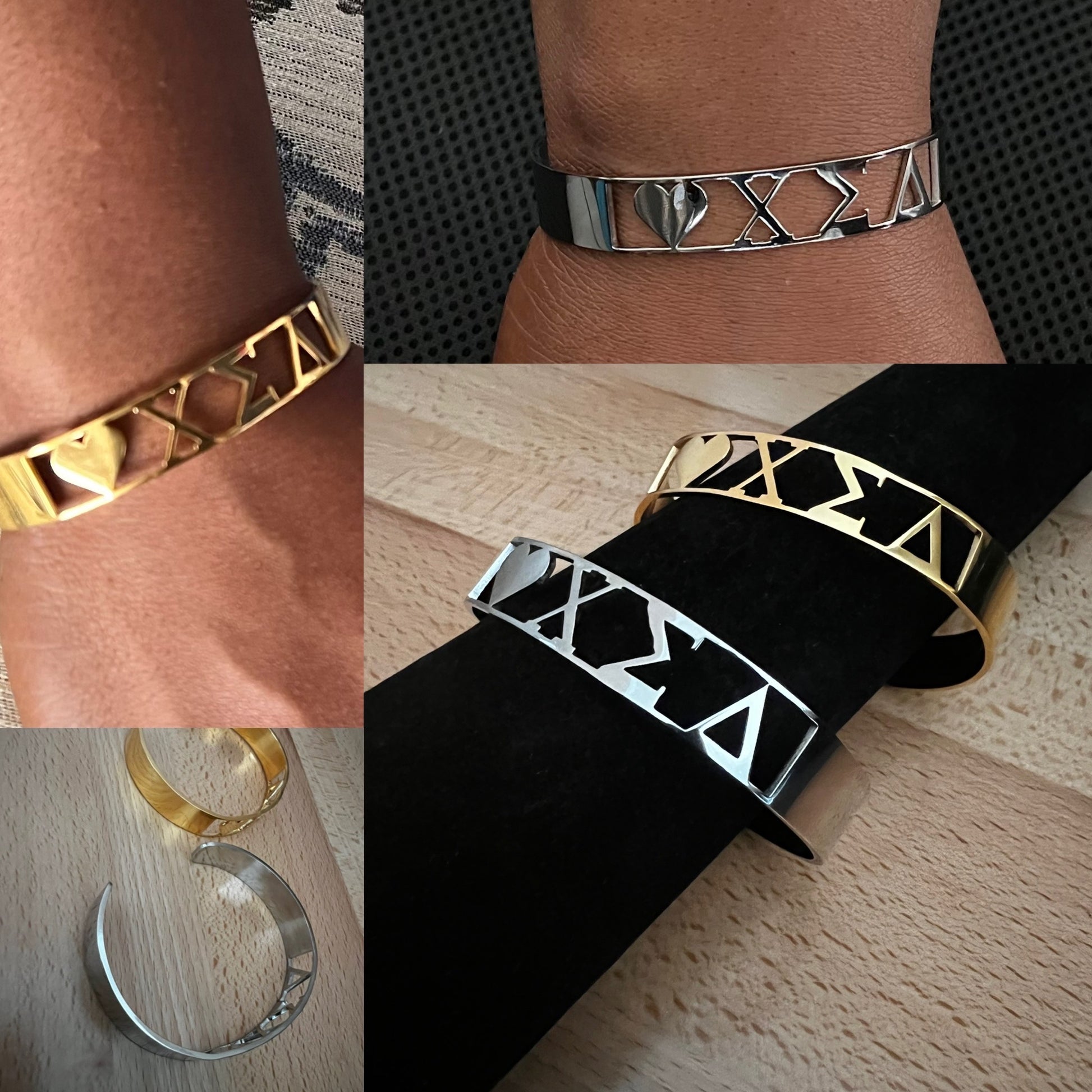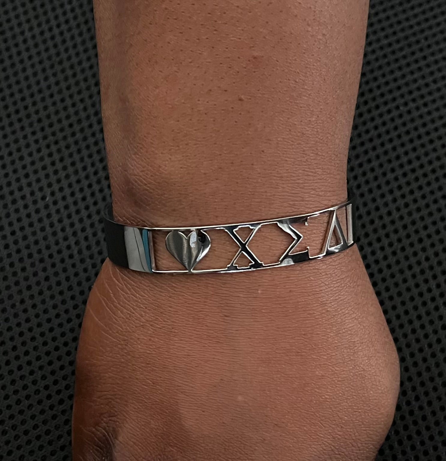 This "Love Chi Sigma Delta" Cuff bracelet is made of stainless steel.