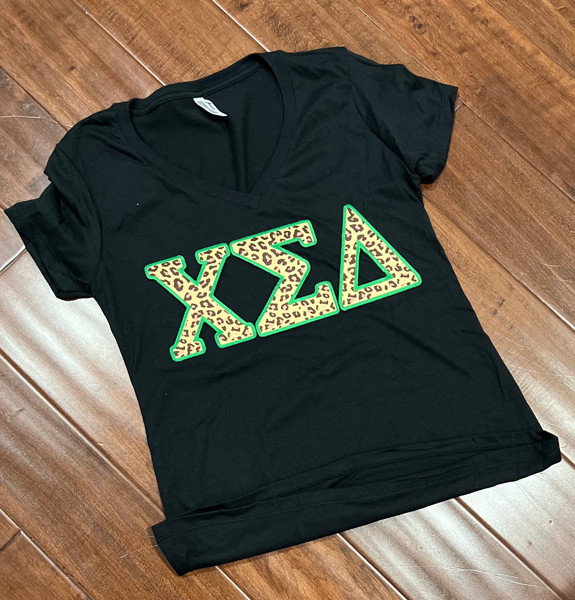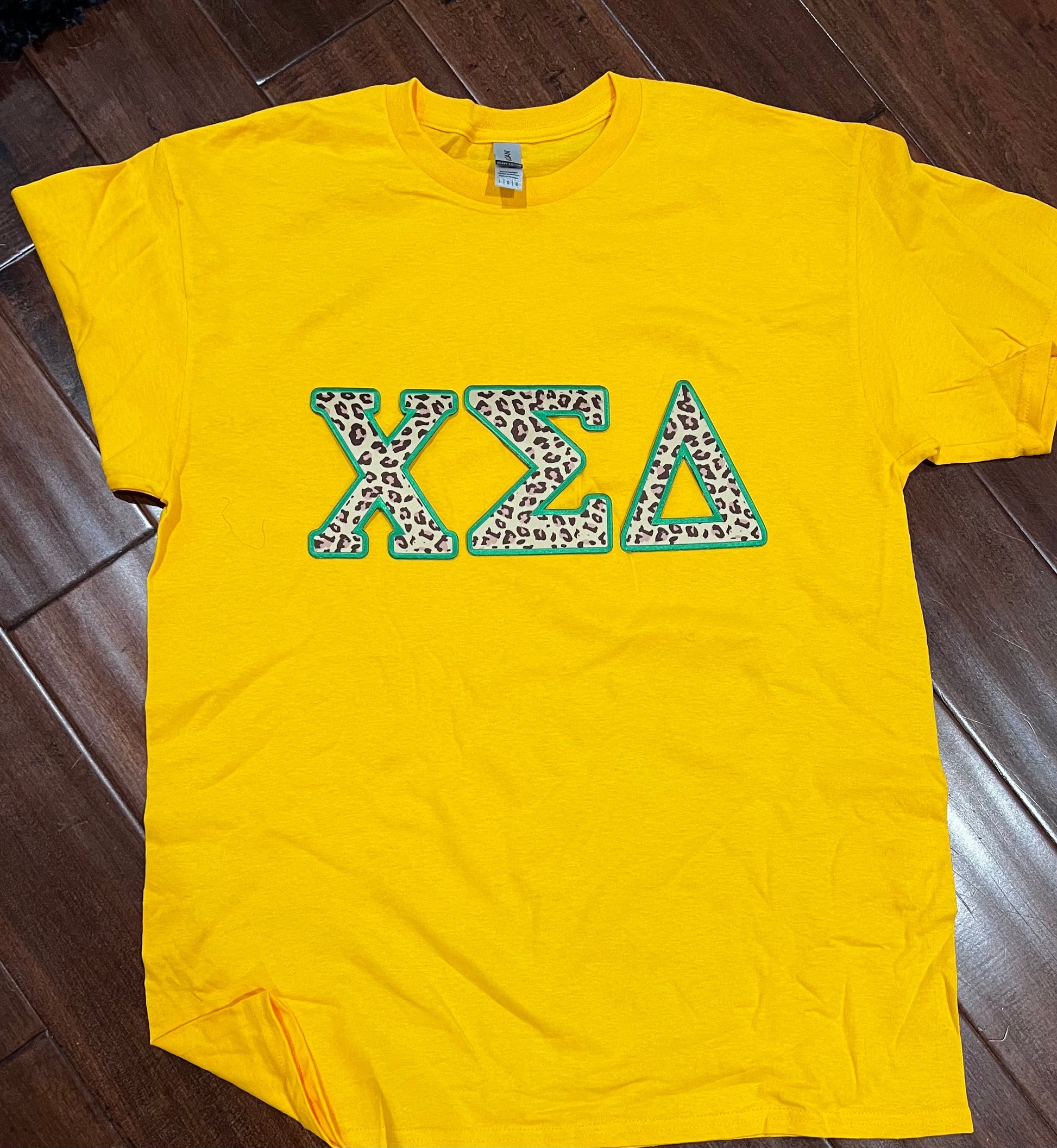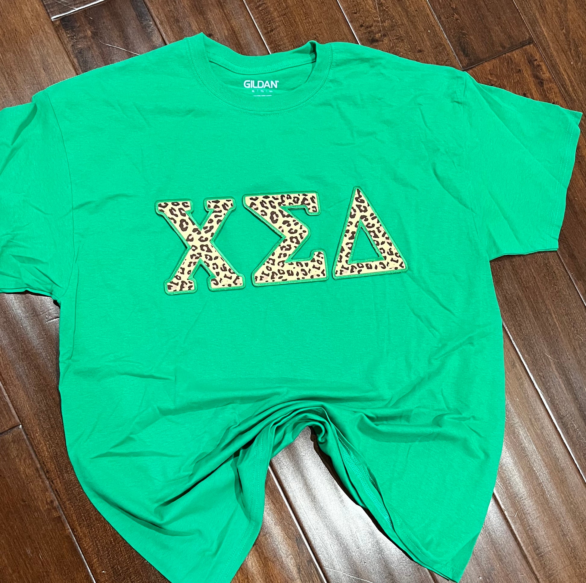 T-shirt is heavy cotton available in 3 colors. Letters are cheetah print style with hunter green embroidery stitching.