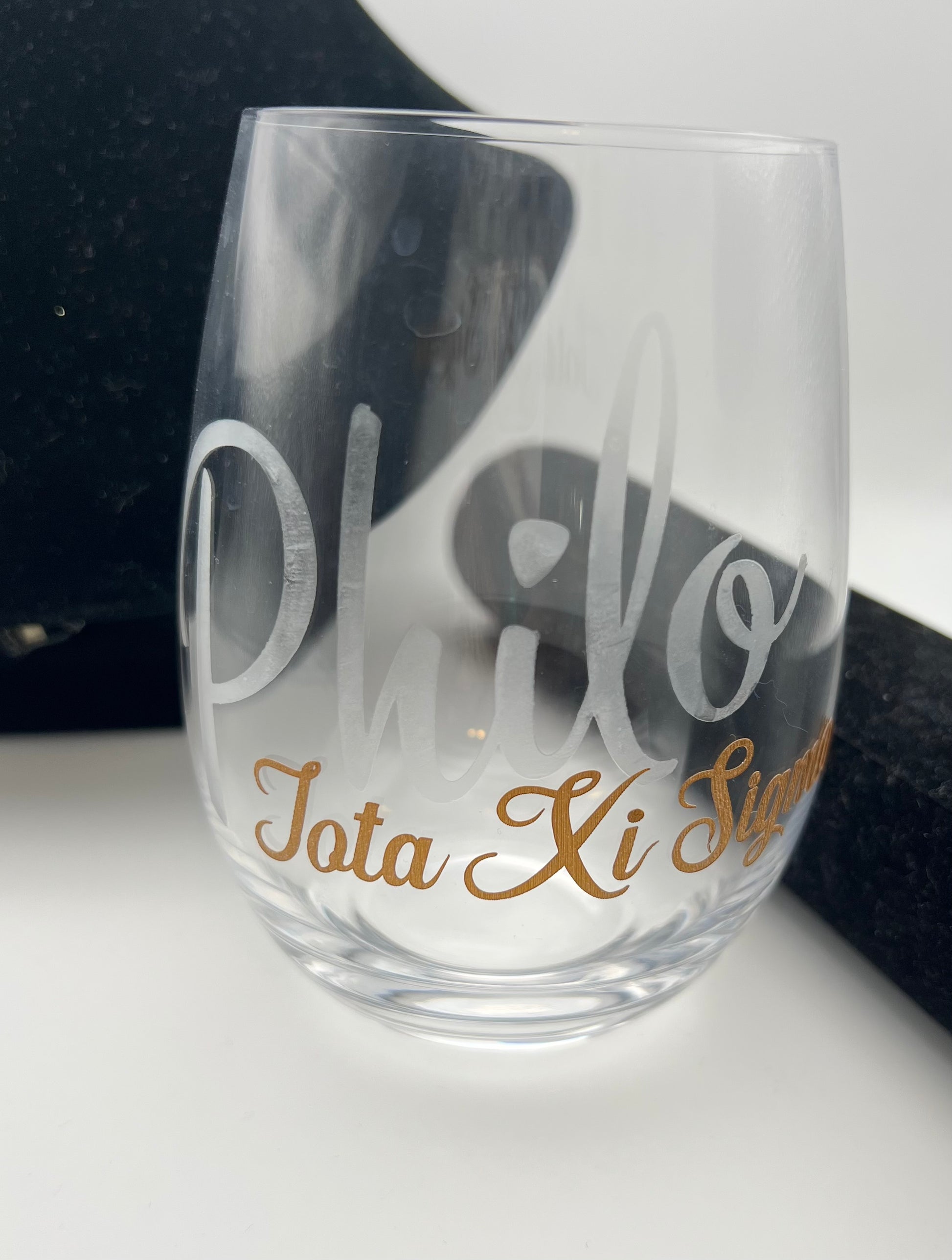 Create your own version of the glass you desire. Glass is etched with Philo across the side. Add your chapter, your name, your choice in gold vinyl.