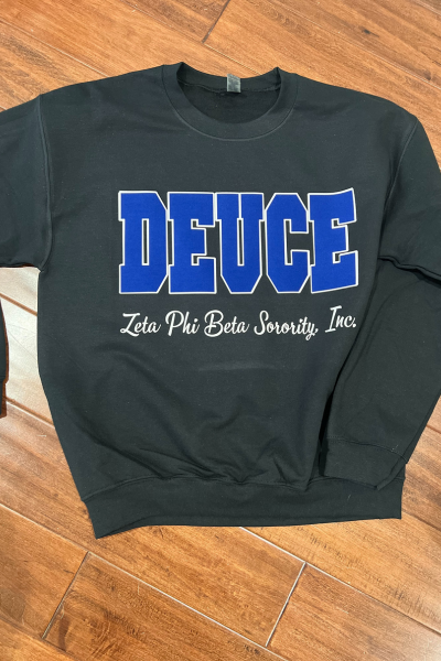Looking for a different design? We also offer the option to replace "DEUCE" with "ZETA" in large letters, with the chapter name underneath. Additionally, you can choose between classic black, crisp white, or vibrant blue for your sweatshirt color.