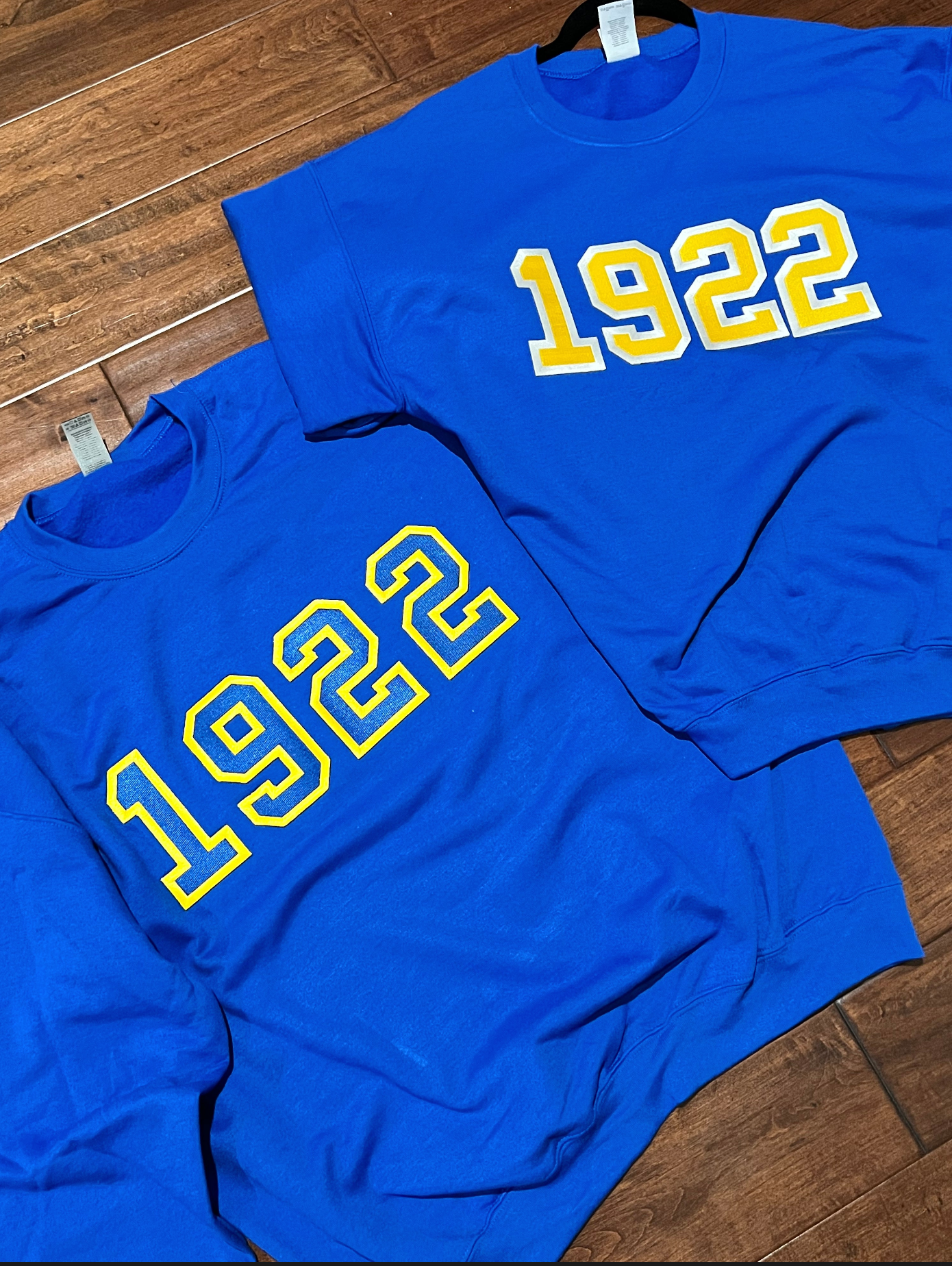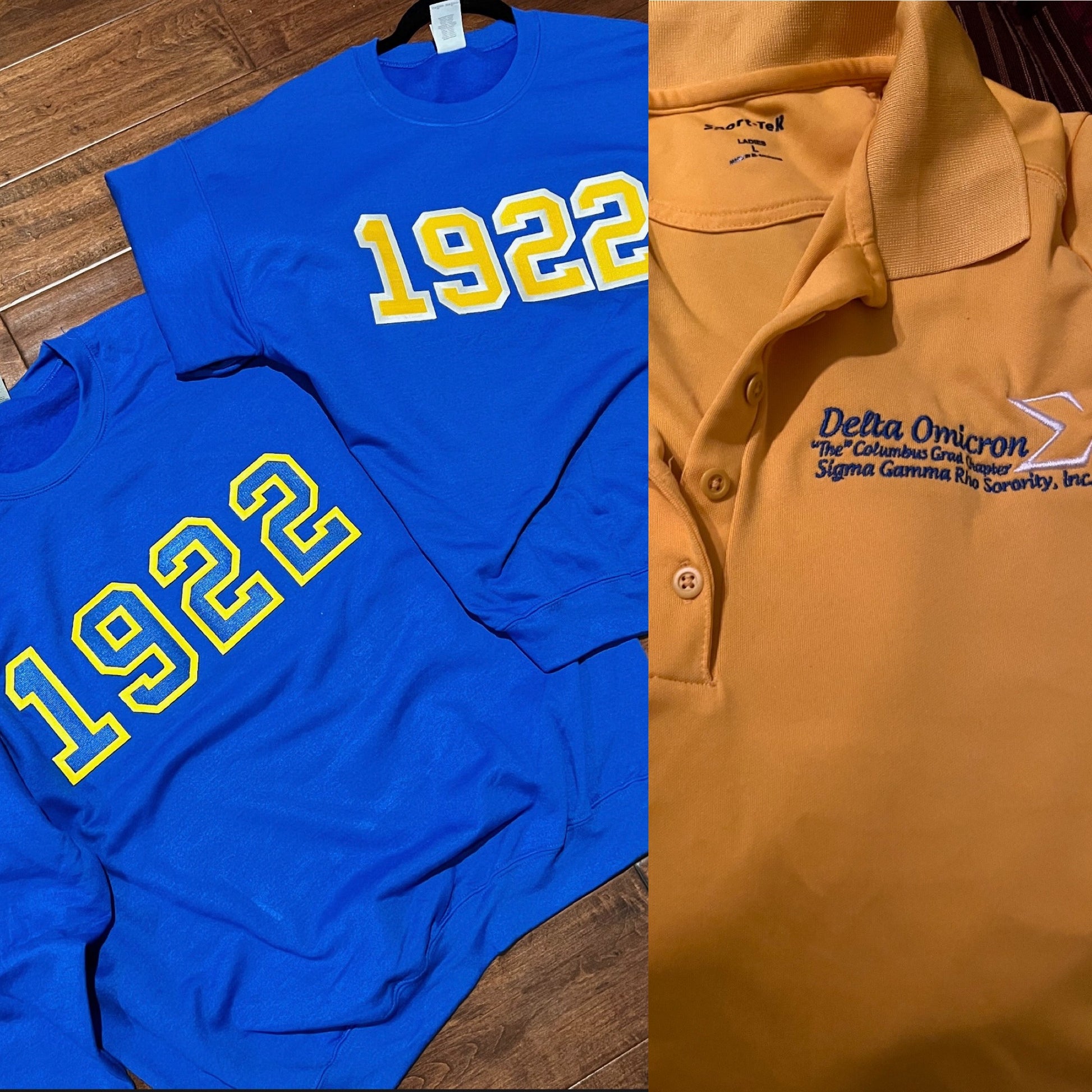 1922 Crew Neck Sweater (with blue and gold numbers) & Gildan Polo Shirt with the words in royal blue: