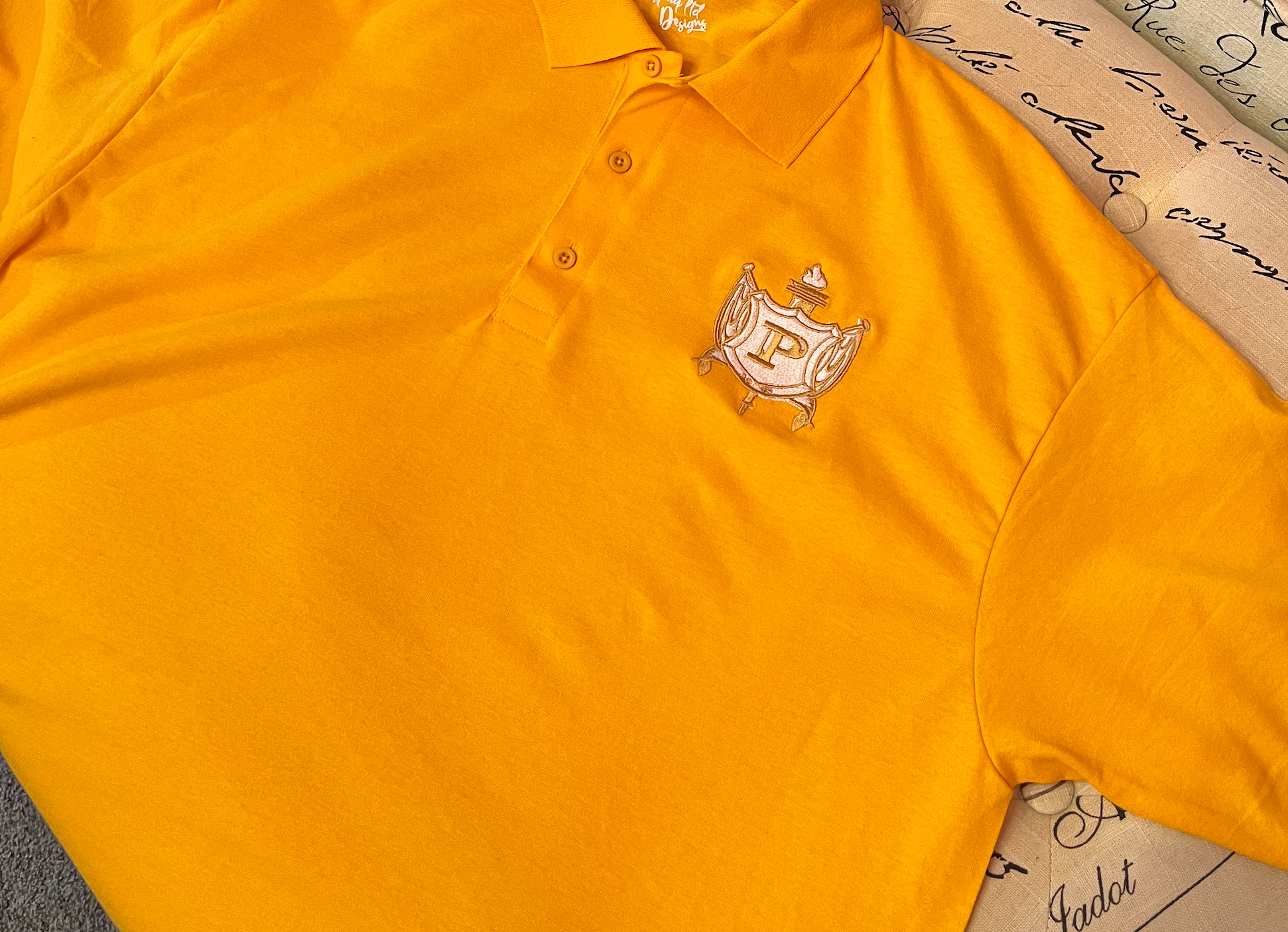 Available in unisex White or Yellow with a direct-to-garment embroidery of the shield or the chapter shield (only if you have one digitized with us). They run large so size accordingly.