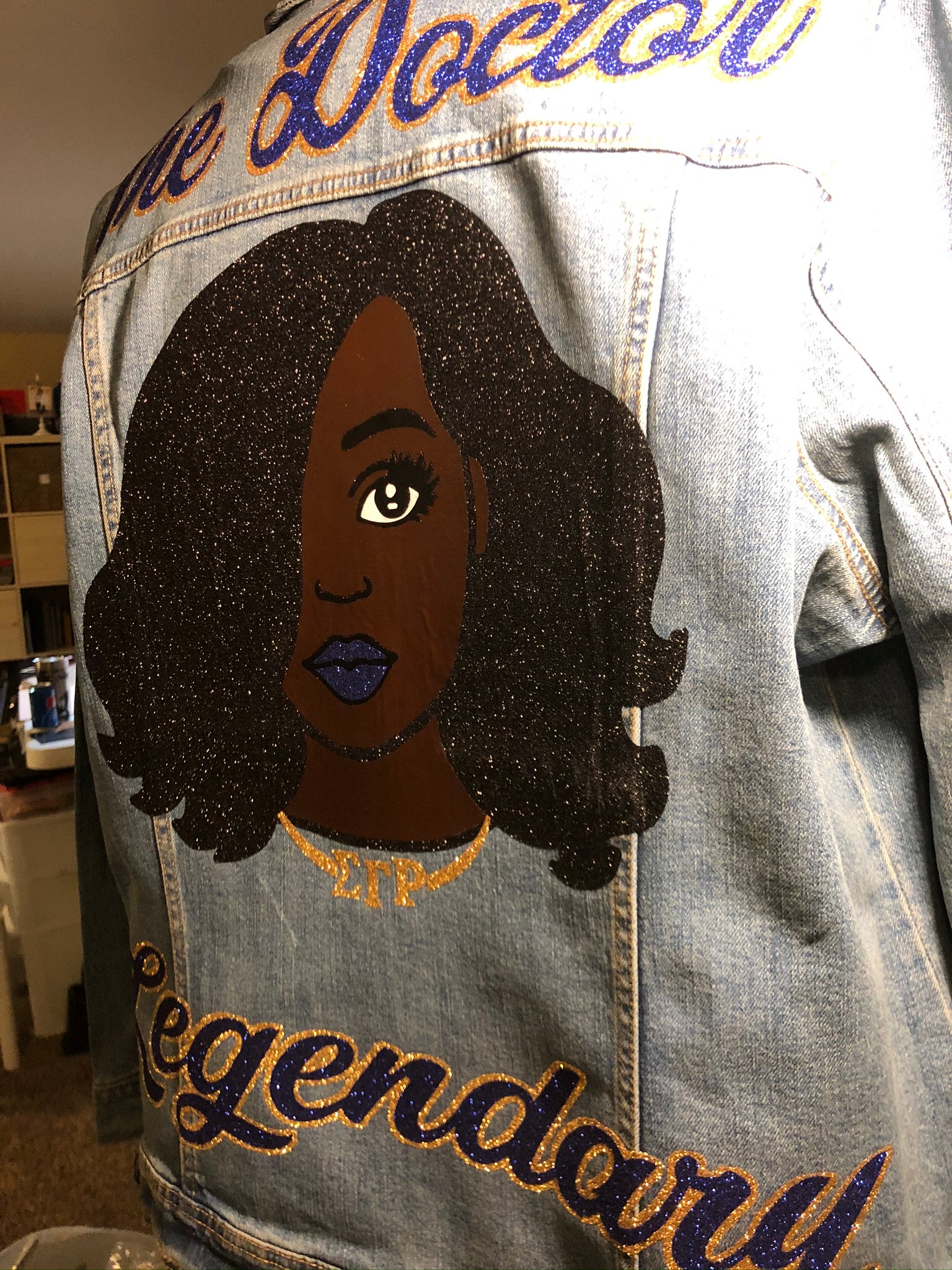 This listing is structured specifically like the jacket shown. Items are done in vinyl or flock as layered images.
