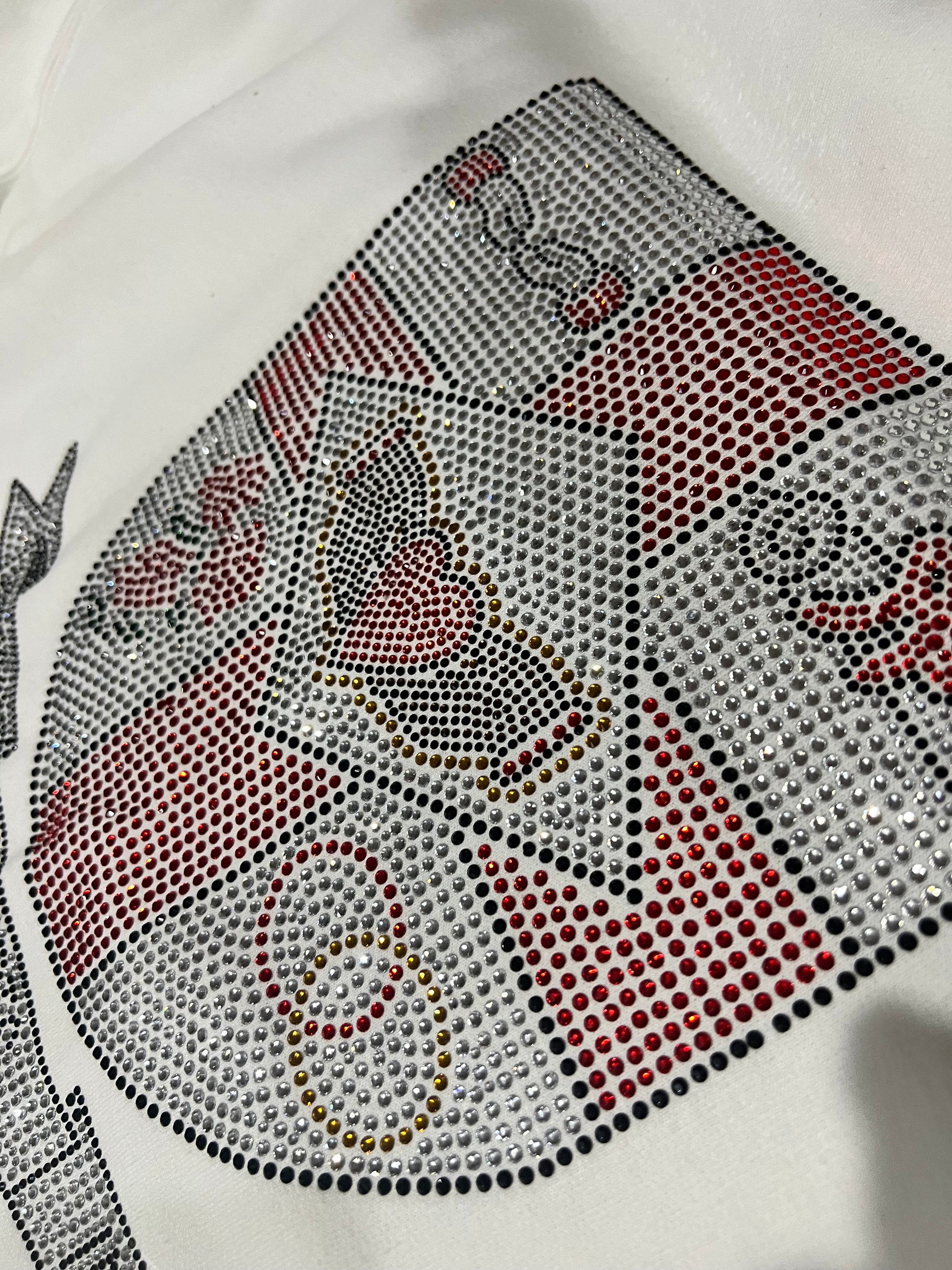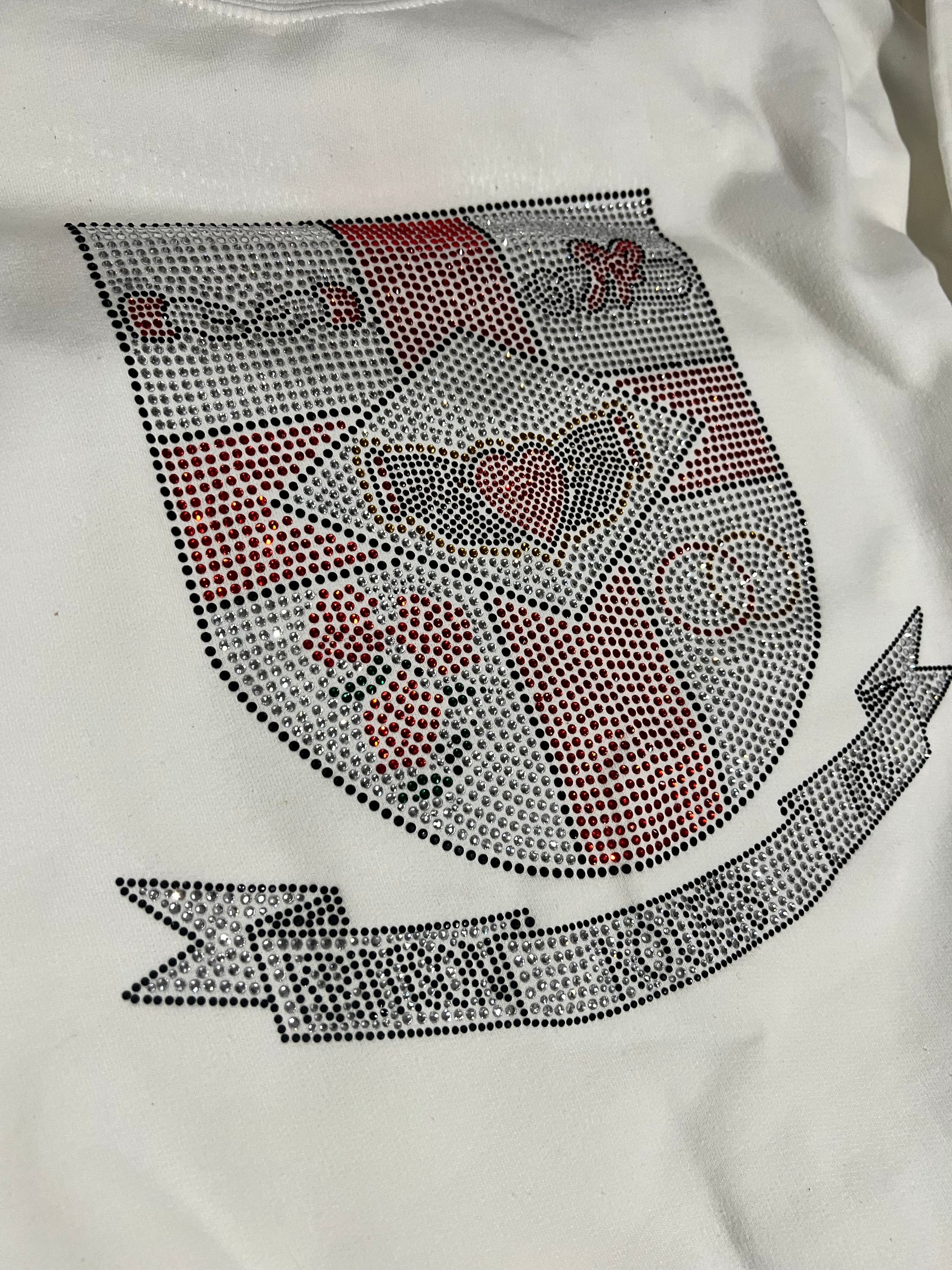 11 x 11-inch Rhinestone image on a White sweatshirt. Sweatshirt runs large.