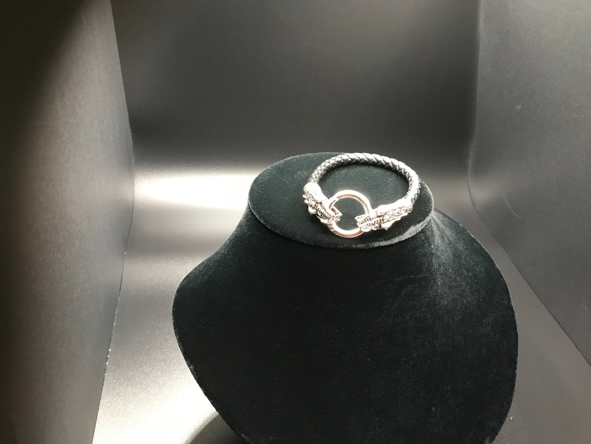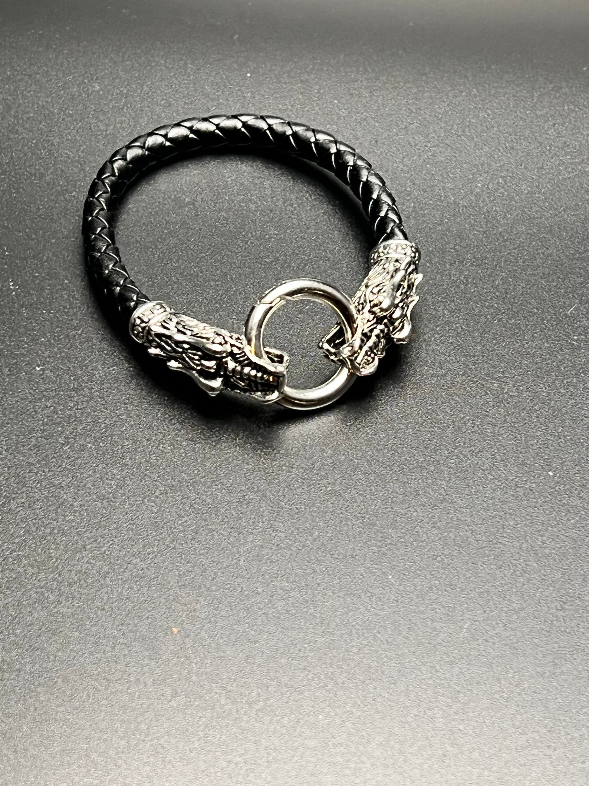 Black Twisted Leather Bracelet with silver lion heads holding a ring.