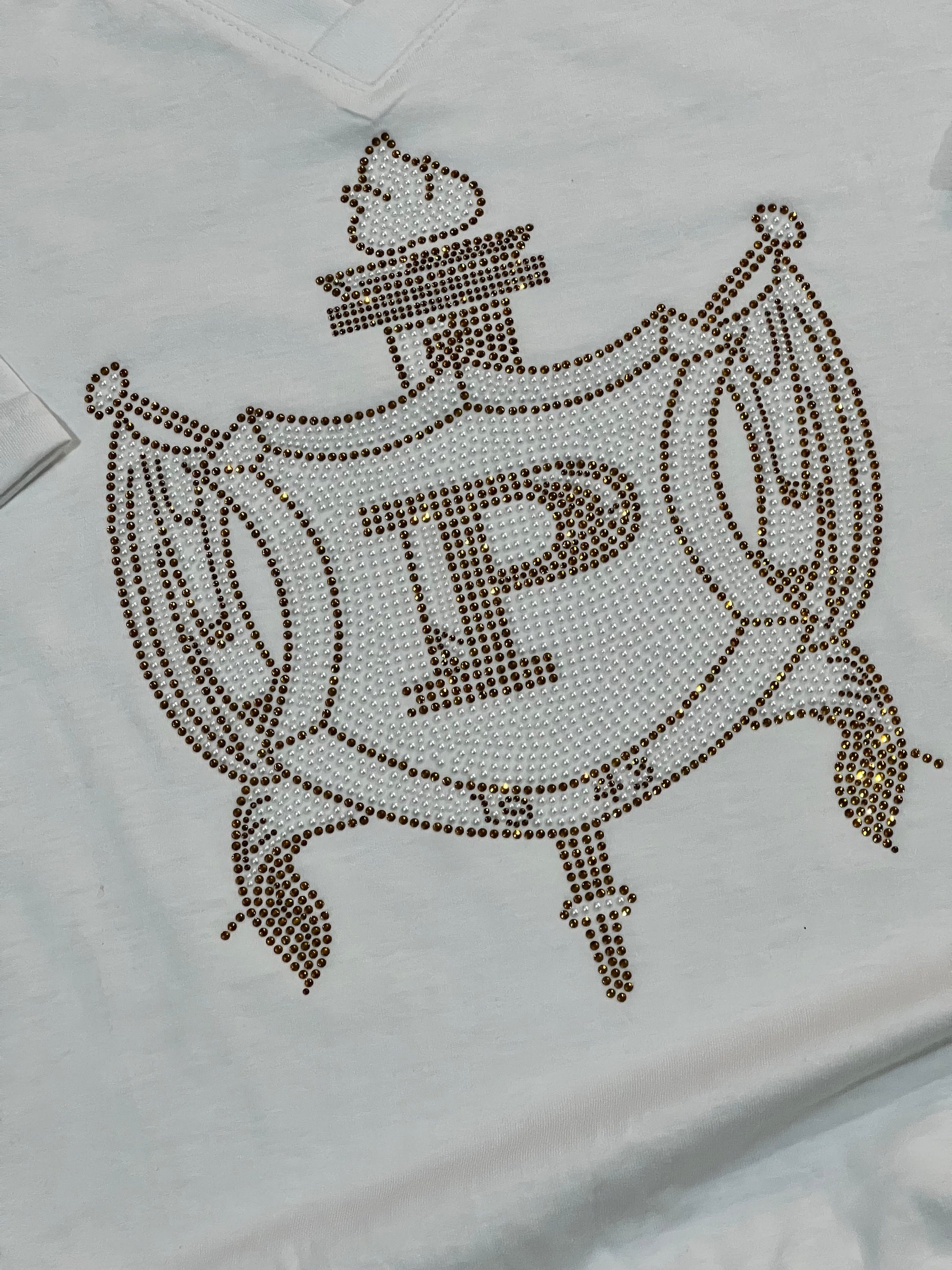 Razor-back Rhinestone tank. Firm-fitted. Beautiful topaz rhinestones and pearls create this shield.
