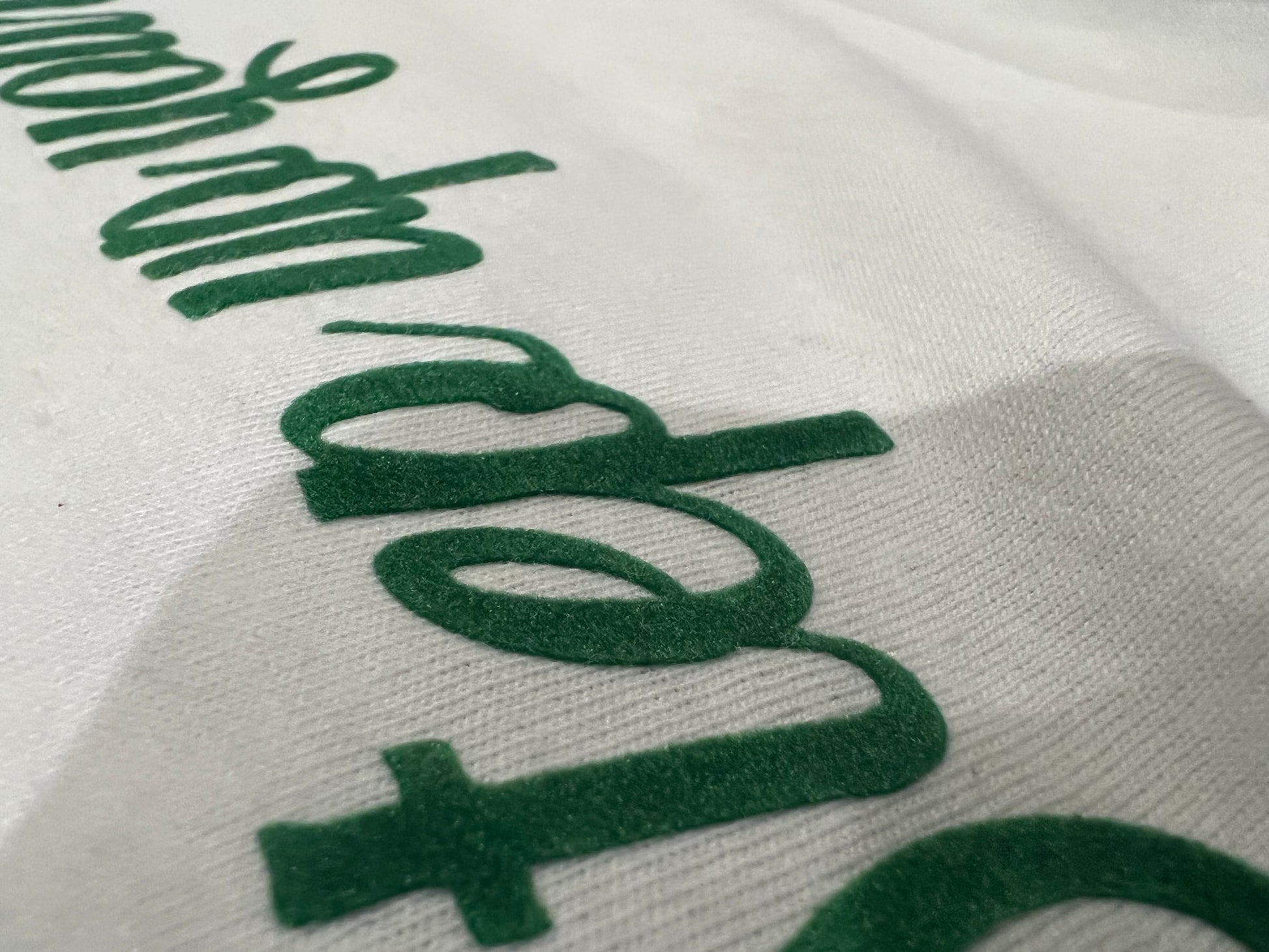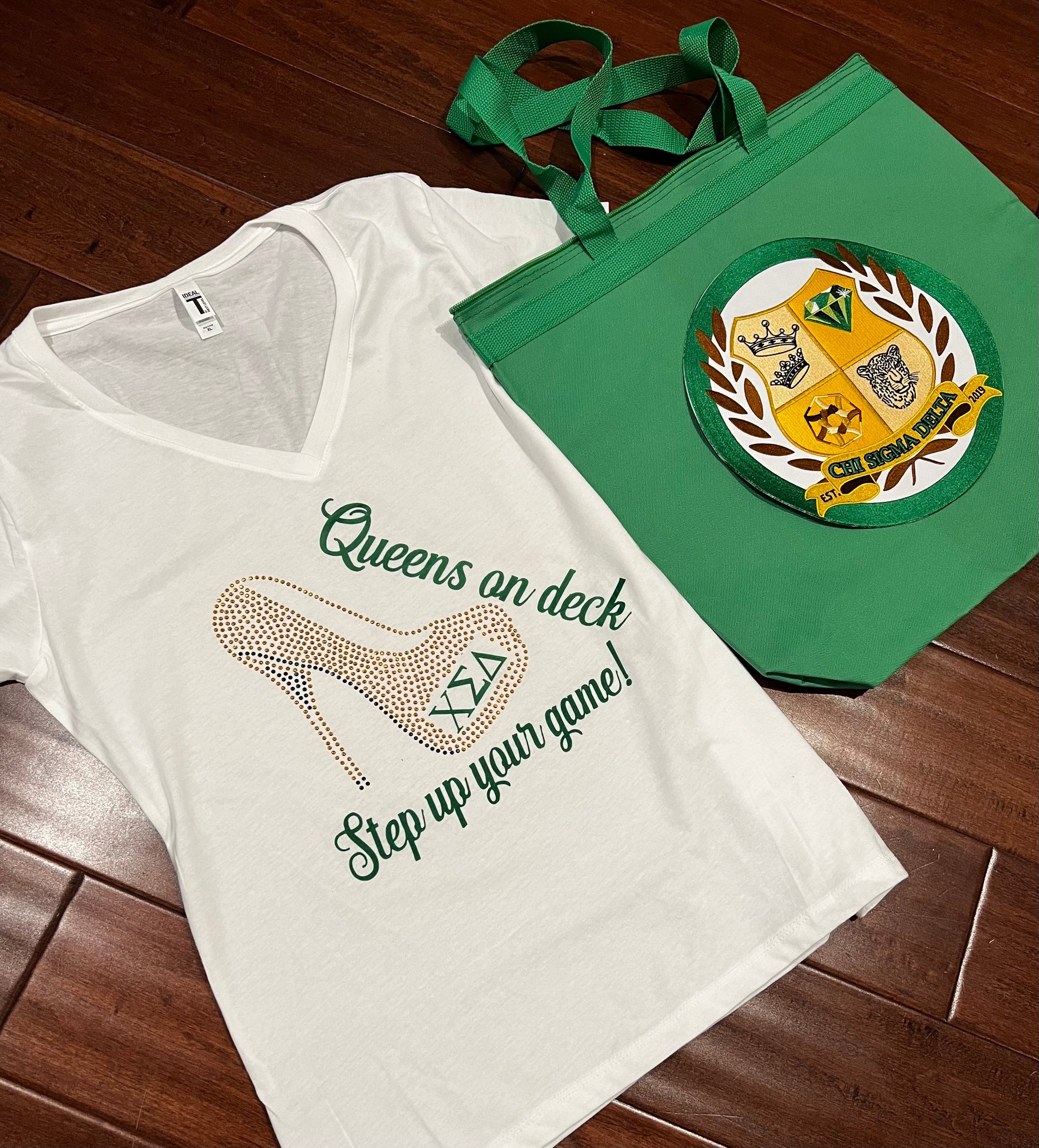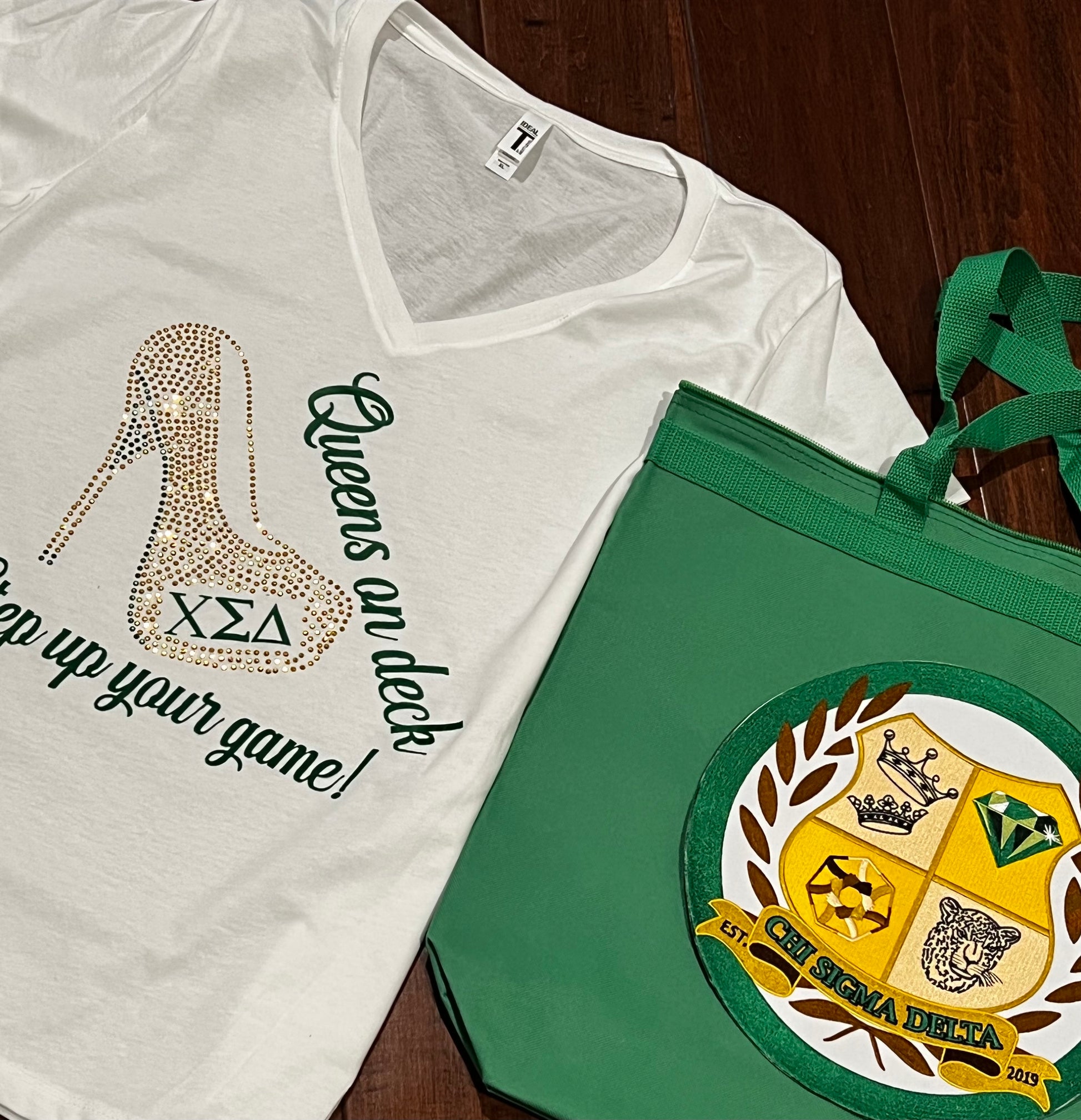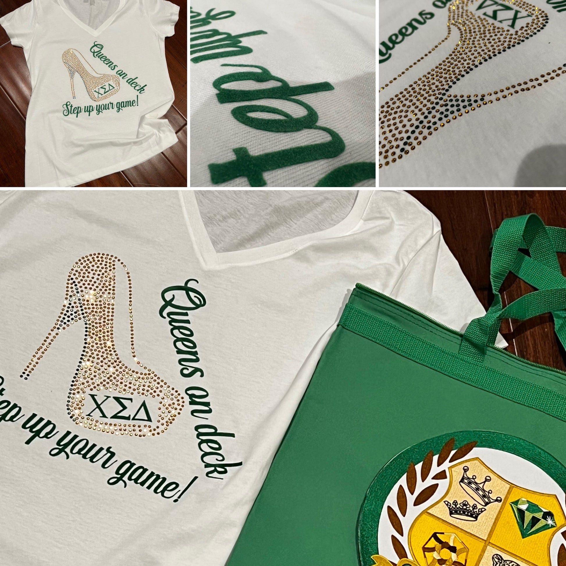 This v-neck tee is adorned with gold and emerald Rhinestuds. Print is done is a 3D-style flock! Would look good on a black v-neck tee as well.