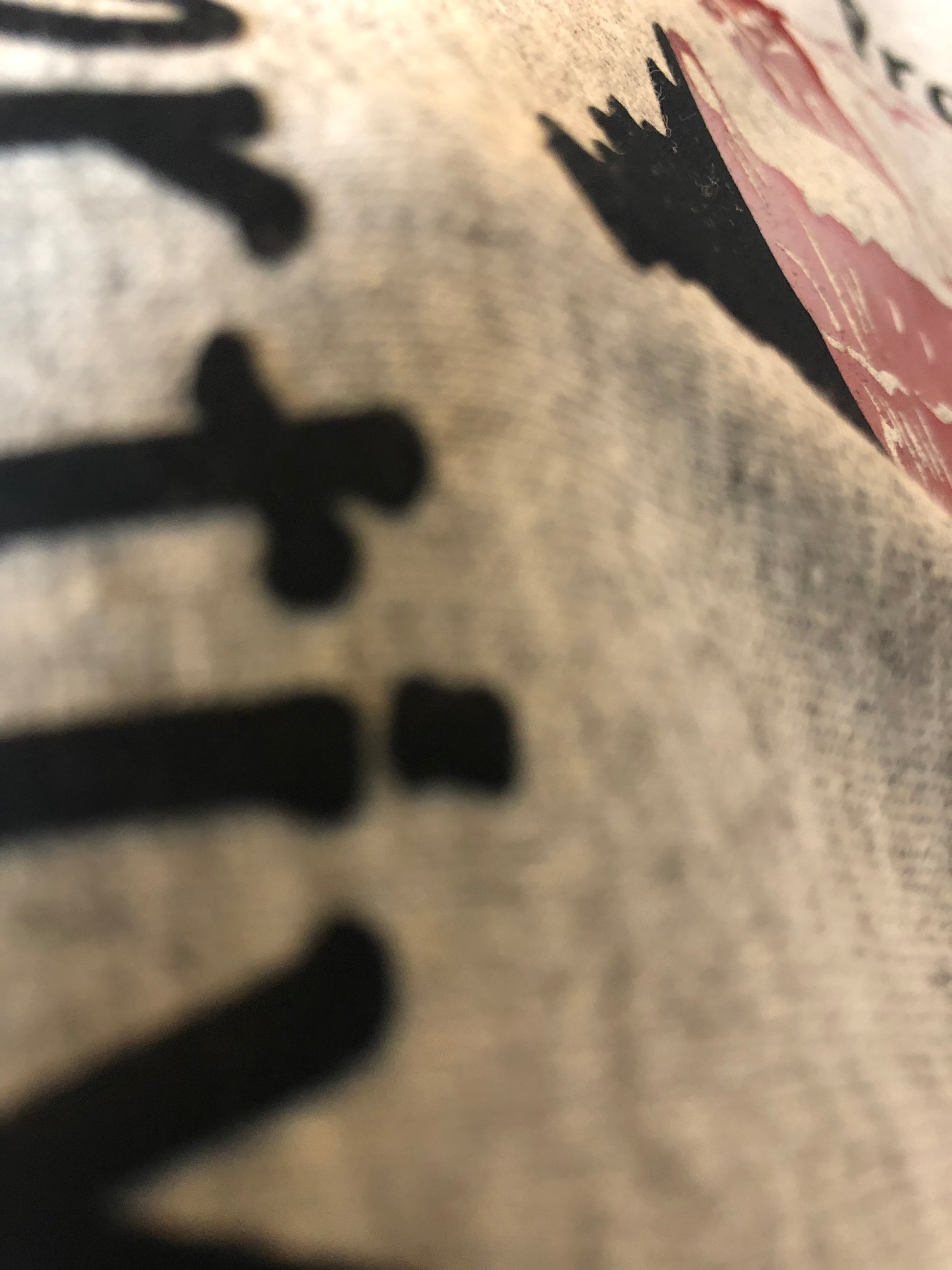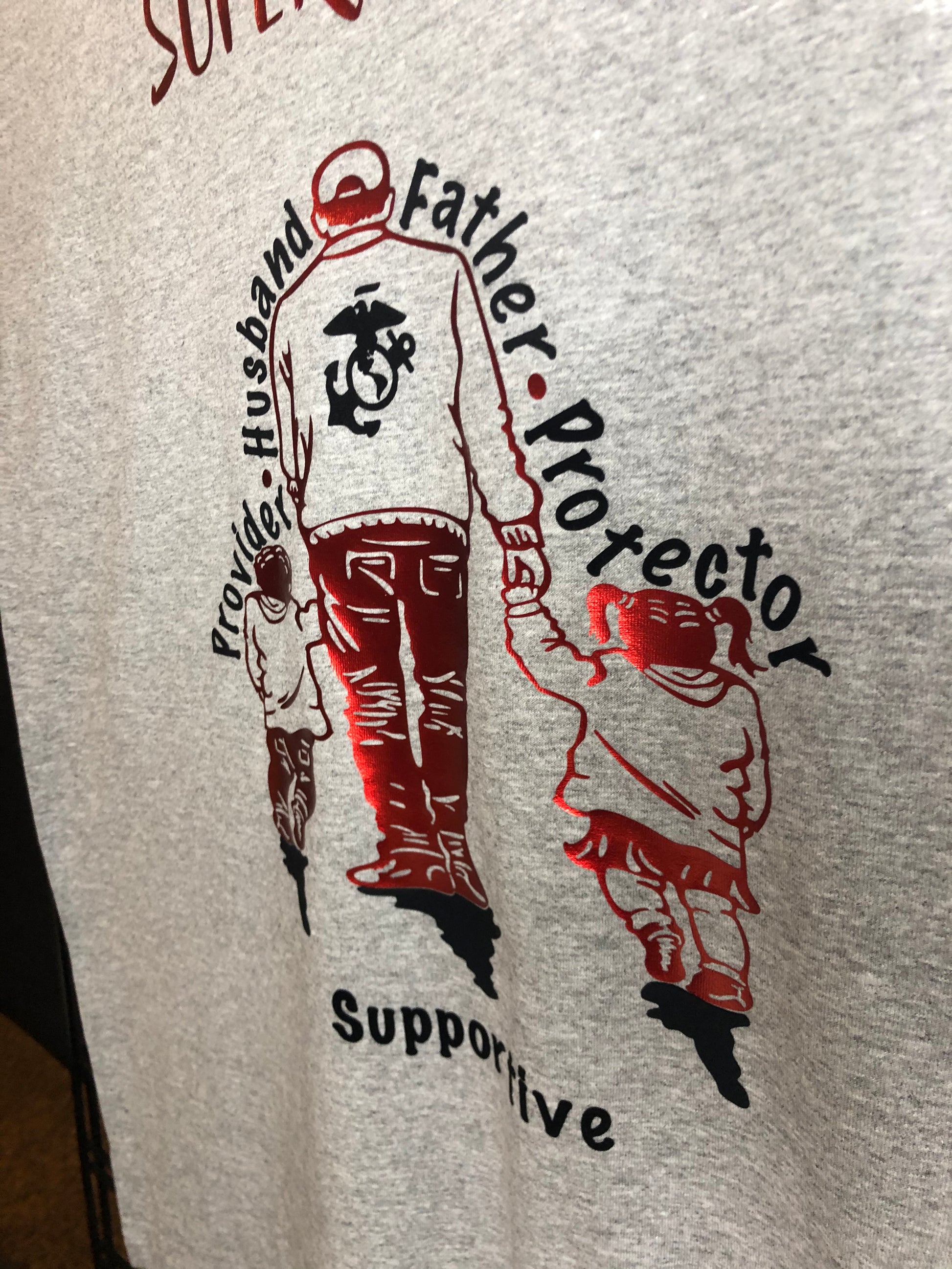This product boasts a glossy red finish with a flocked (fabric-feel) outline. This particular shirt is personalized with the Marine symbol on the back. Available in a sweater, long-sleeve, or short sleeve.