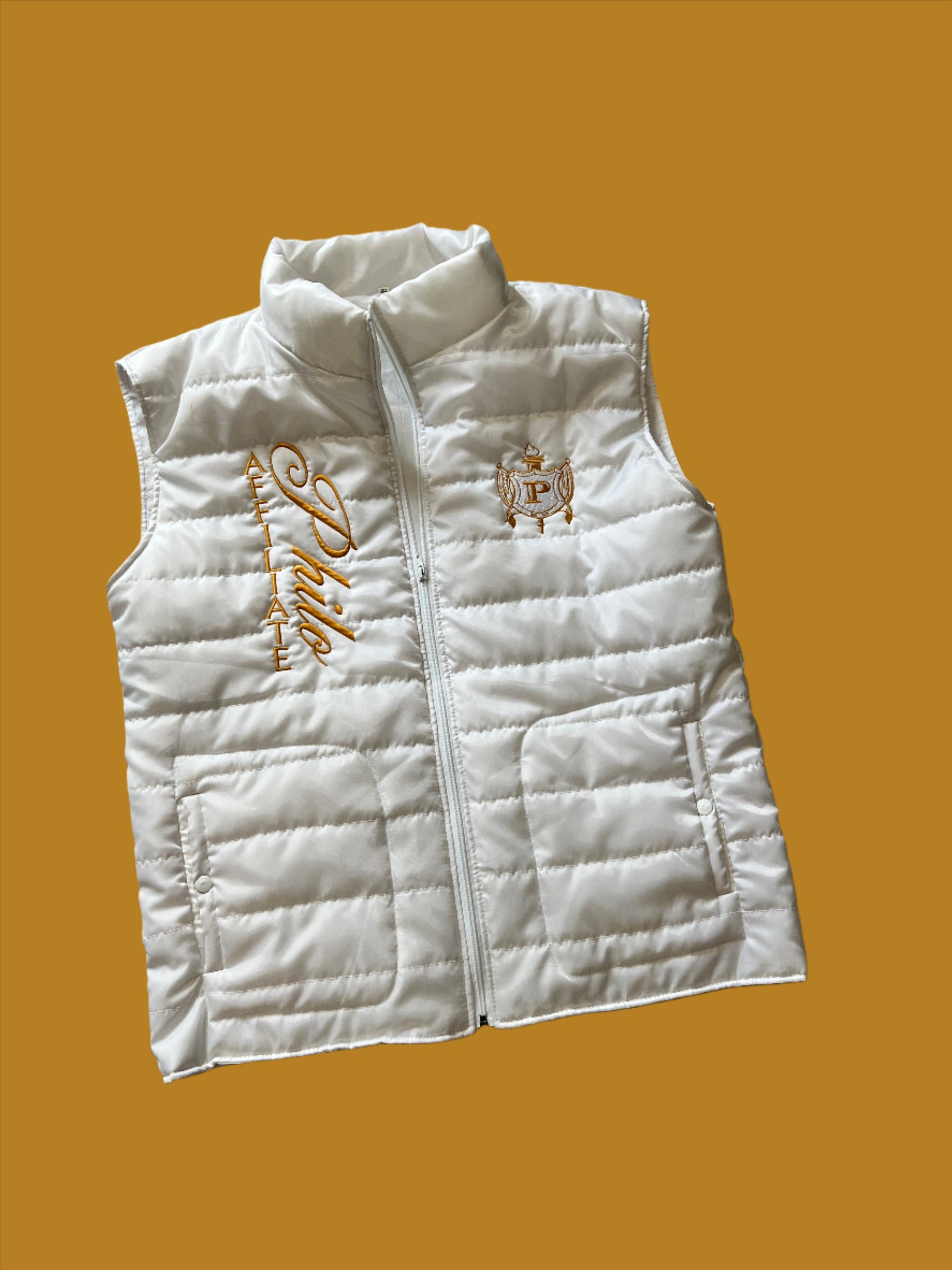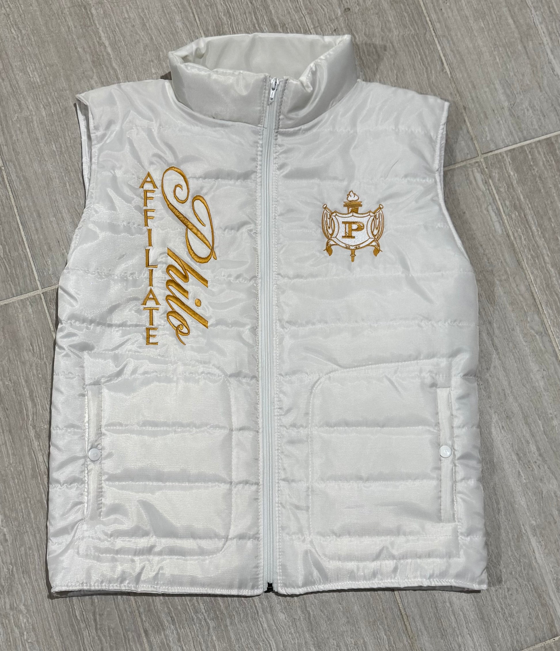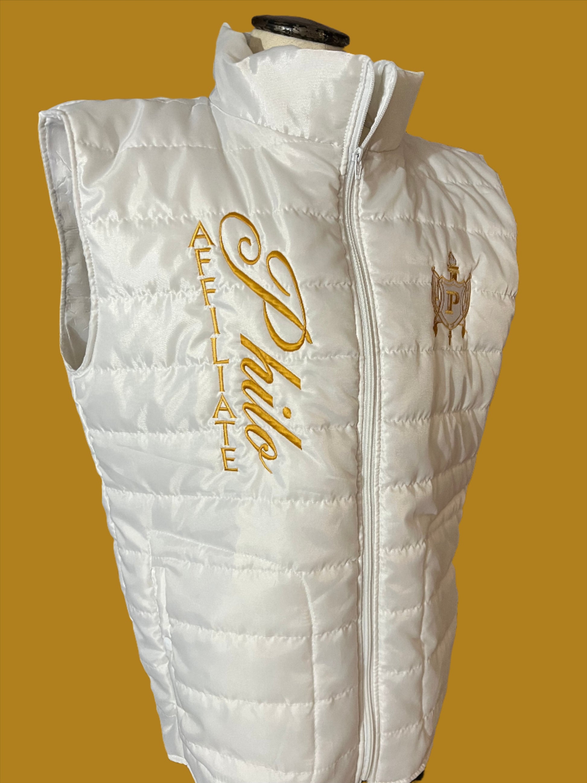 Philo Puffer Vest with direct-to-garment embroidery Philo Affiliate along the right side and the crest OR your chapter shield on the left.