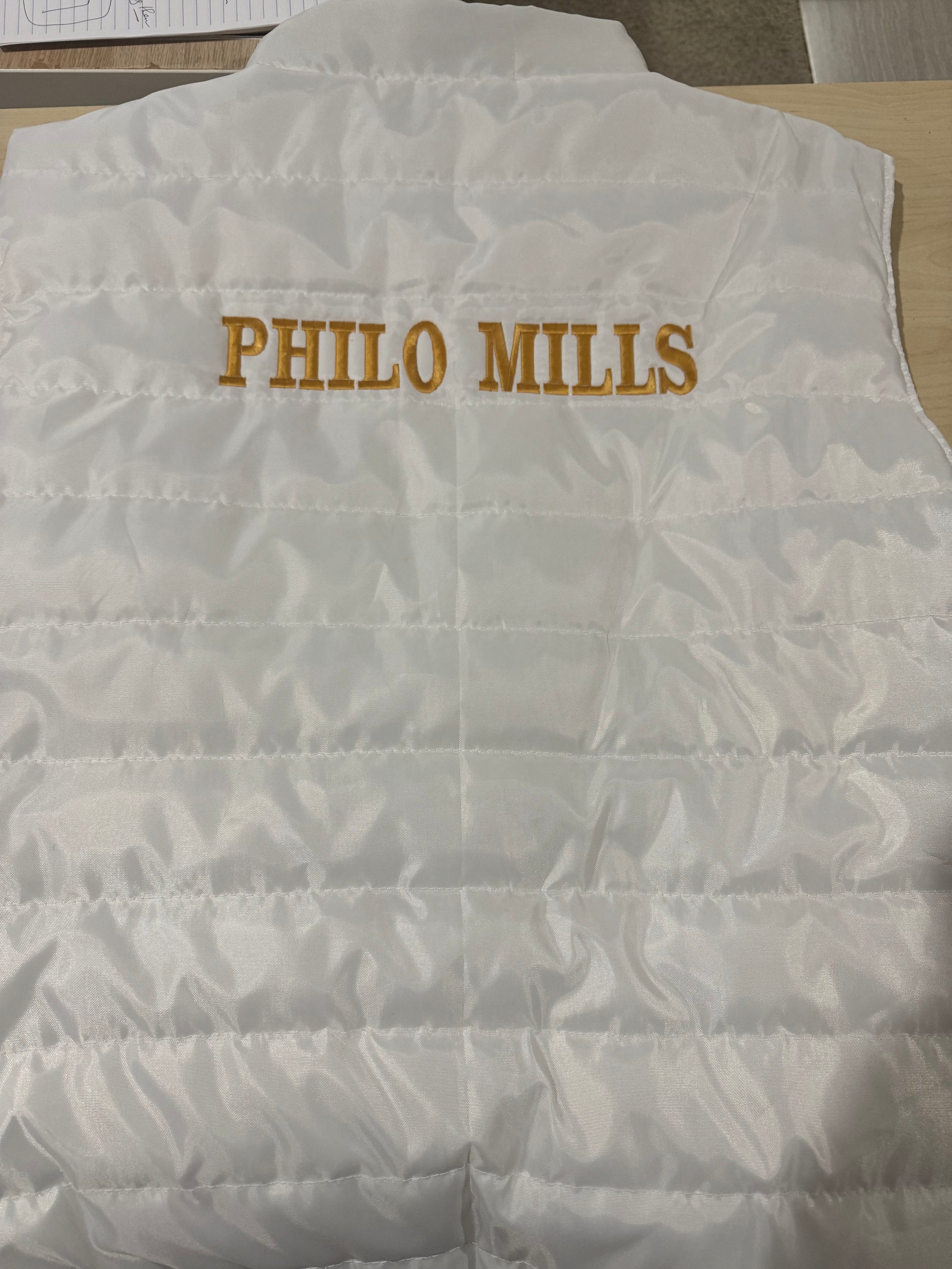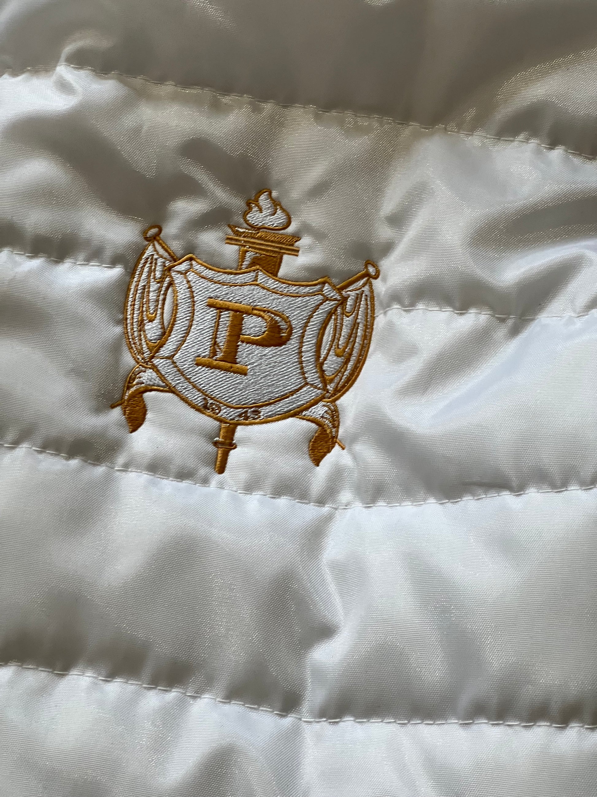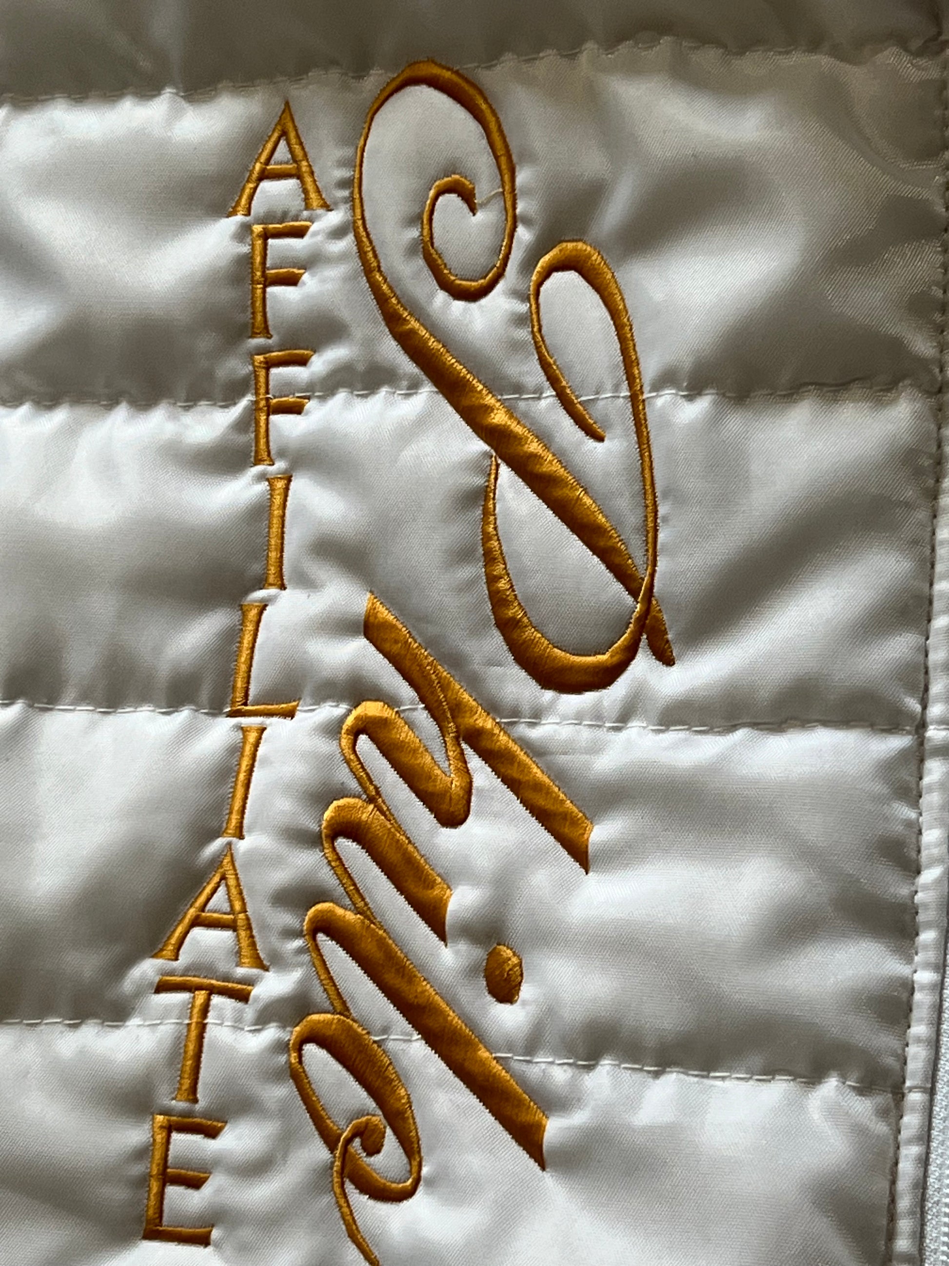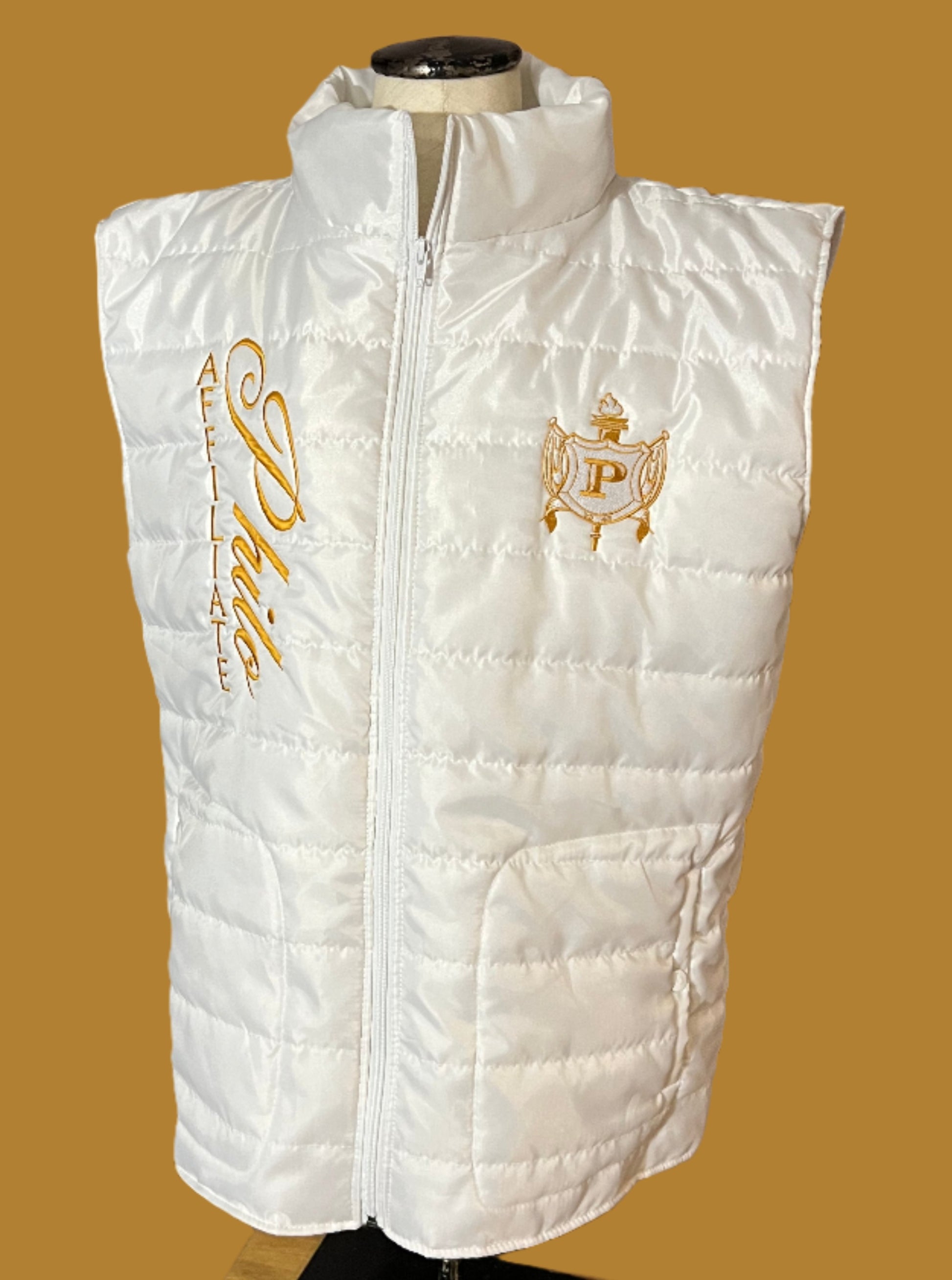 Philo Puffer Vest with direct-to-garment embroidery Philo Affiliate along the right side and the crest OR your chapter shield on the left.